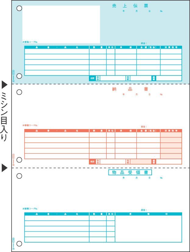 レーザープリンタ用帳票。A4サイズ3分割(売上伝票/納品書/物品受領書)1箱500枚入り。ミシン目切り離し後のサイズ;99x210mm。ファイル穴2穴。ファイル穴間隔:80mm。紙厚:0.08mm坪量;64g/m2。