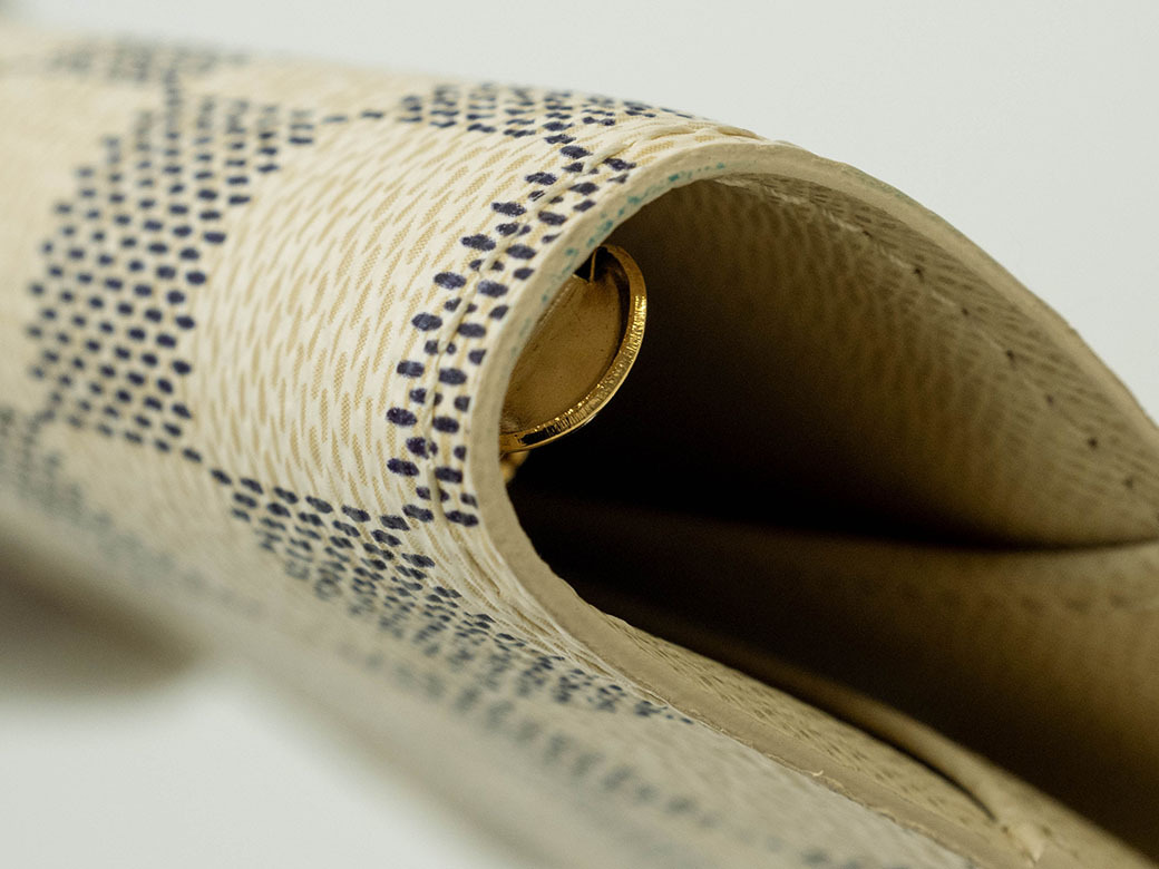 外側 | 僅かな反り返り コバにインク汚れ ボタンに僅かな変色 |