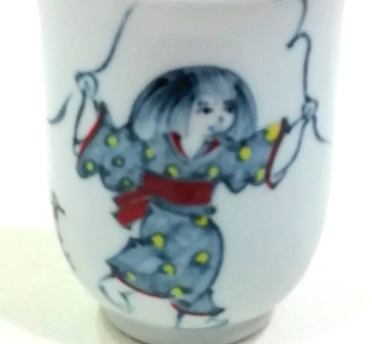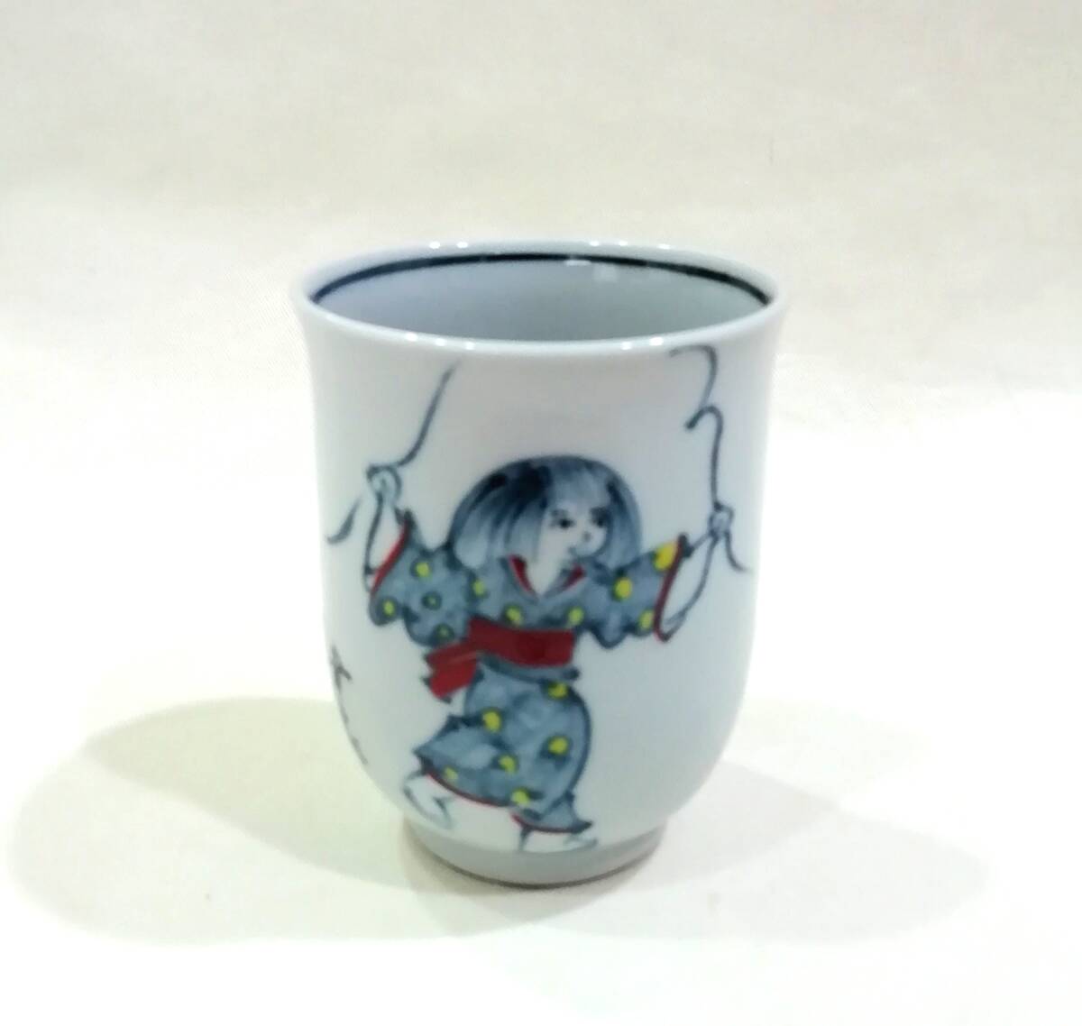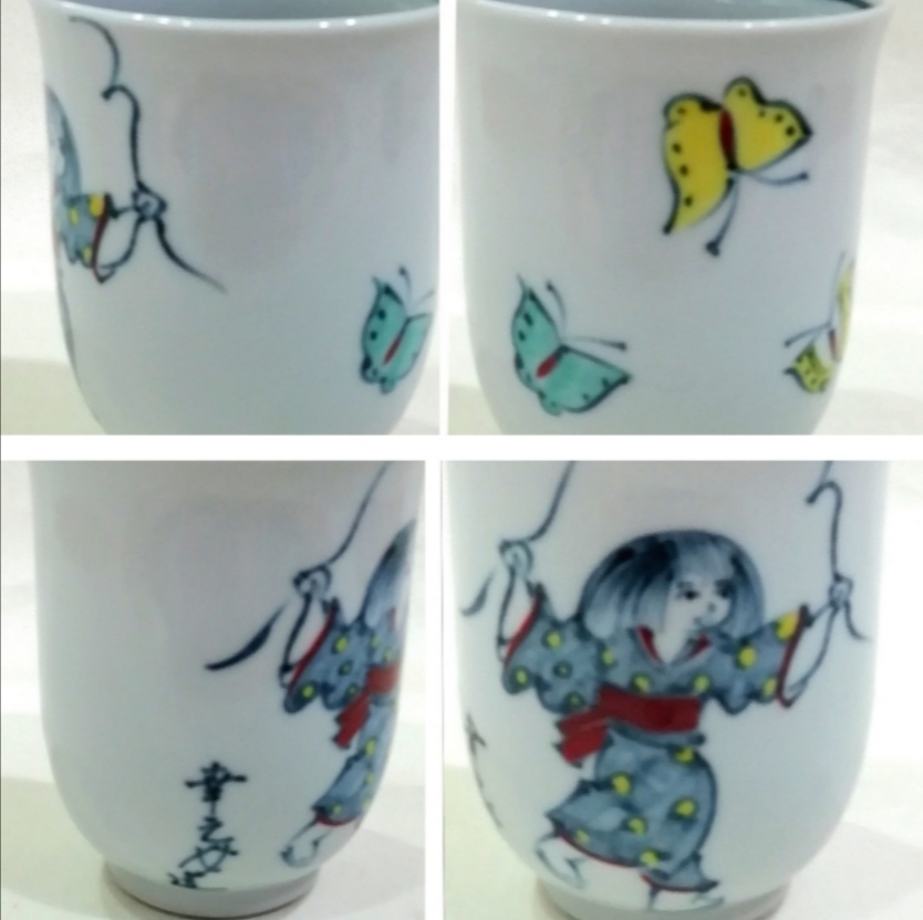 京焼 六齋窯 村田幸之介造 ”童遊び湯呑”です。正面に縄跳びをする女の子が、背面には3羽の蝶が描かれ、”幸之介造”と書かれています。童の素朴で可愛い表情、色絵の華やかな絵付けに魅力があります。初代幸之介 (昭和6年〜平成11年) 昭和51年 南林社京都府知事賞受賞、昭和52年 日本南画院特賞受賞、昭和53年 日台韓三国展、 昭和54年 日本南画院理事、平成3年 清水焼の絵付指導始める 各百貨店にて個展。二代幸之介 昭和38年〜 昭和56年 父の指導を受け修行、平成11年 二代目幸之介として作陶、平成15年 横浜高島屋、平成16年 大阪高島屋にて個展。少し古いものですが目立つような傷みはありません。京焼 六齋窯 村田幸之介造 ”童遊び湯呑”が楽しめます。古いものである事をご理解の上、写真で判断頂ける方にお願い致します。古いものである事をご理解の上、写真で判断頂ける方にお願い致します。口径約7,0㎝、高さ約8.8㎝。