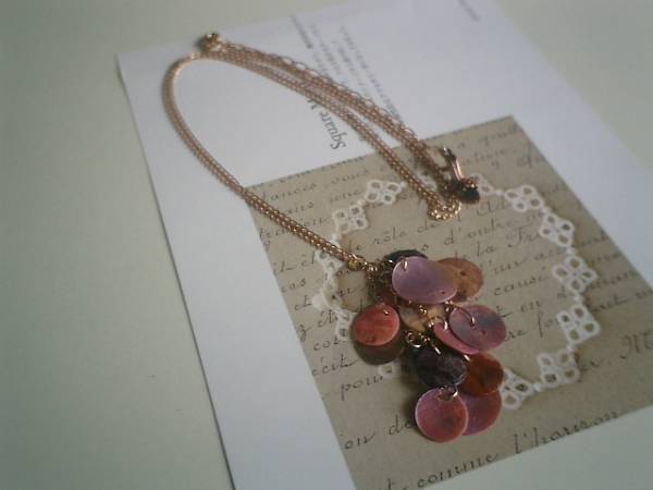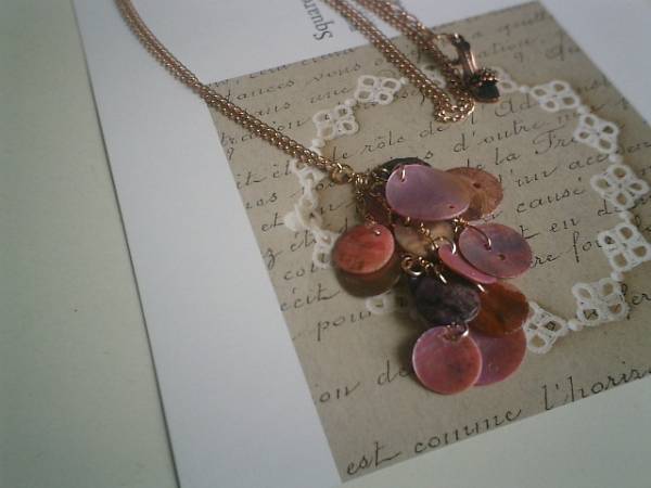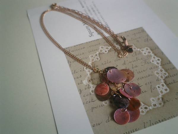 センチメンタルシリーズです♪シックなピンクを集めて・・キュートで可愛いネックレスです♪シックなモーヴピンクやパープル系の10ミリから18ミリ位までのシェルをブーケのように集めて可憐な表情です♪長さは75センチ+アジャスター15センチで最長90センチ位です♪♪お揃いのネックレスやブレスレットや同じシリーズも出品しています♪シンプルで飽きのこないいつまでも着けられるデザインを考えて作りました!ハンドメイドをご理解頂いてノークレーム、ノーリターンでお願いします