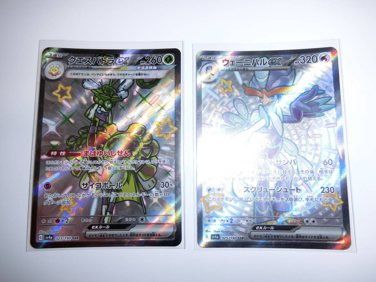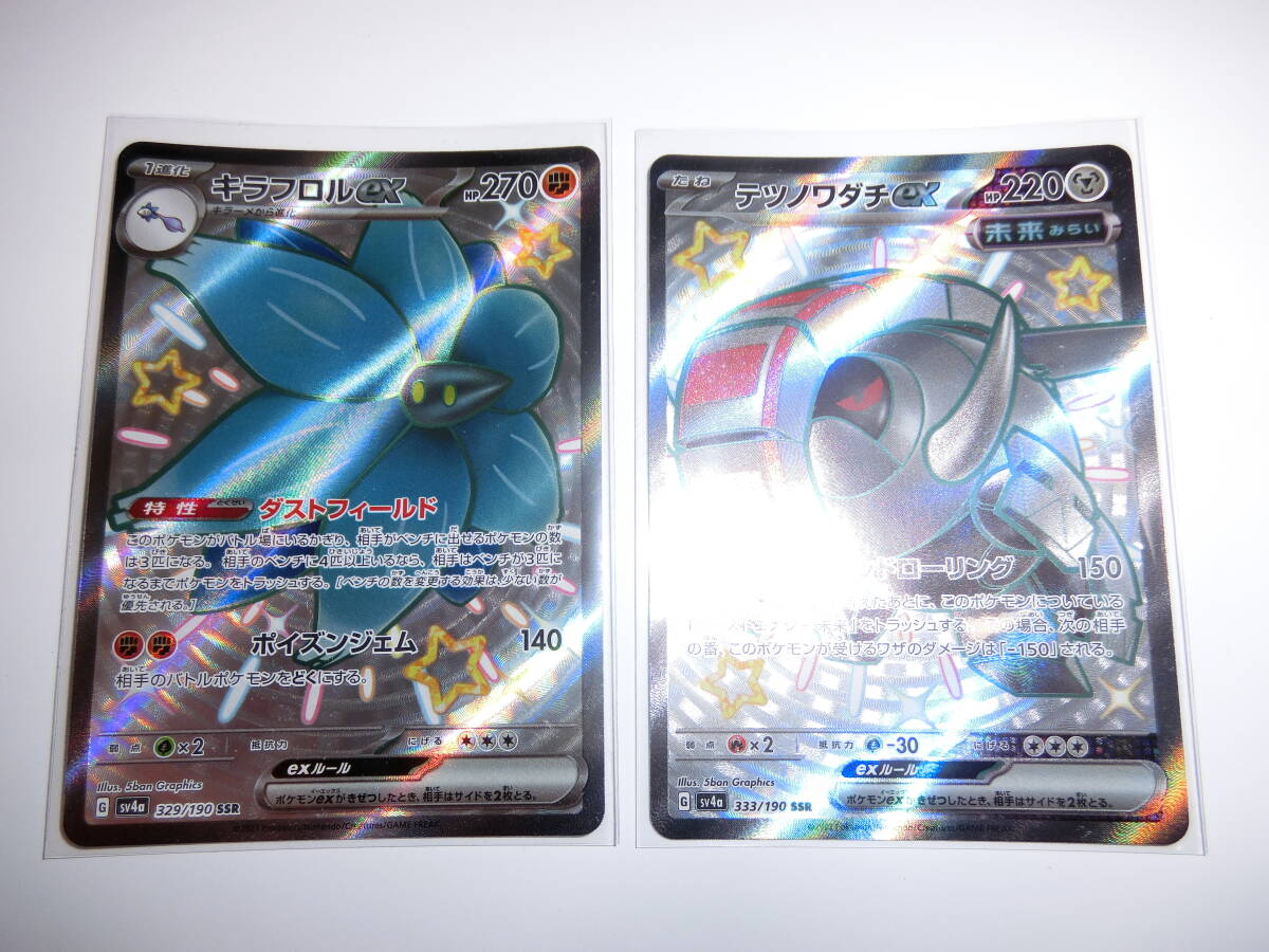 ポケモンカードゲームスカーレット&バイオレットsv4a シャイニートレジャーexより329 キラフロルex(SSR)・333 テツノワダチex(SSR)・ウェーニバルex(SSR)・クエスパトラex(SSR)です。