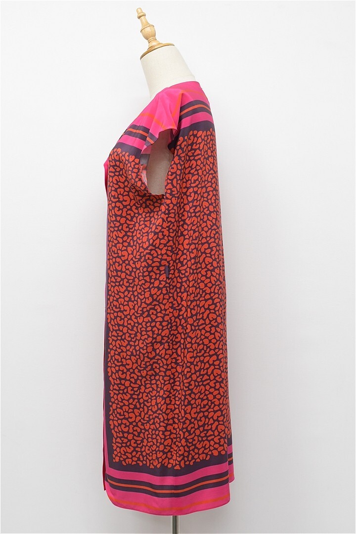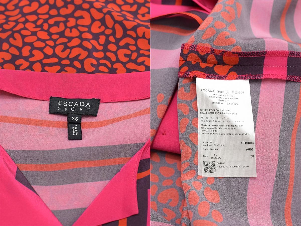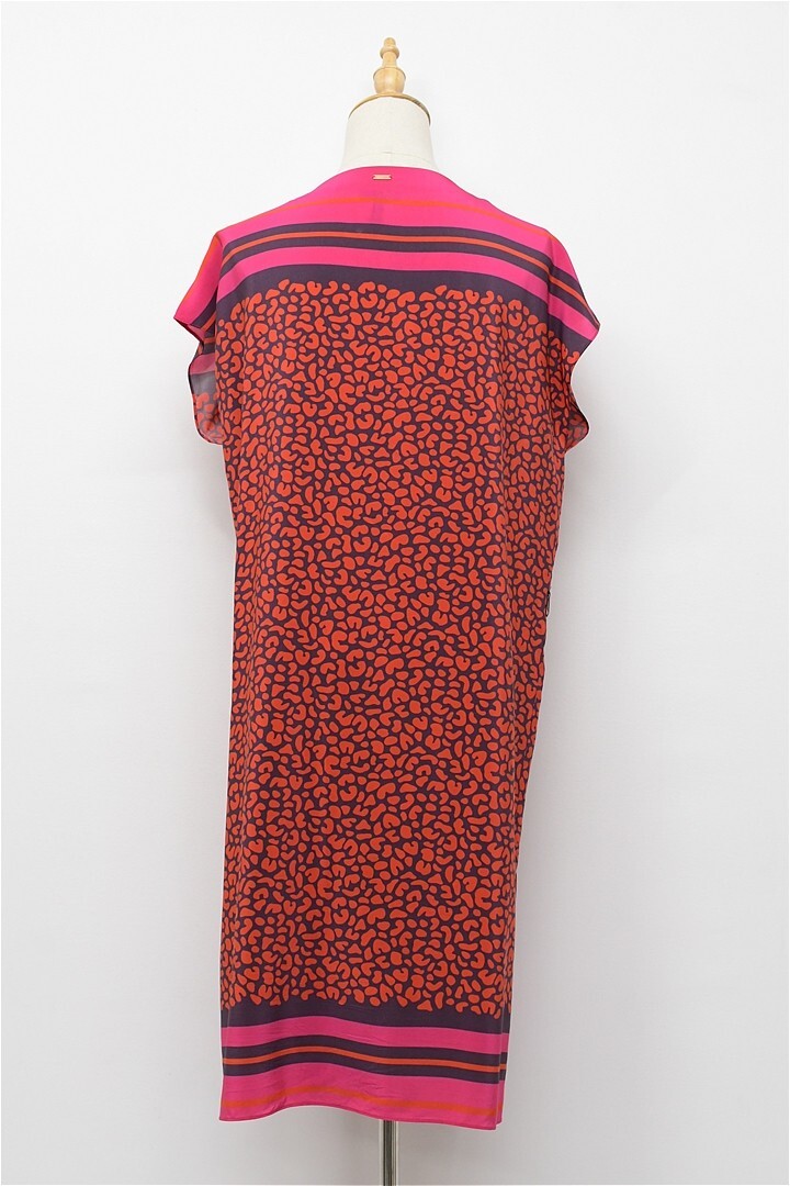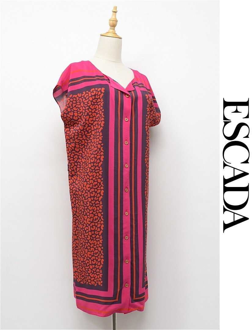 R-K380/ESCADA ひざ丈ワンピース ドレス シルク 総柄 羽織 薄手 ロゴプレート 36 M~L ピンク 赤
