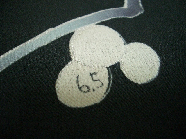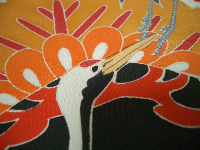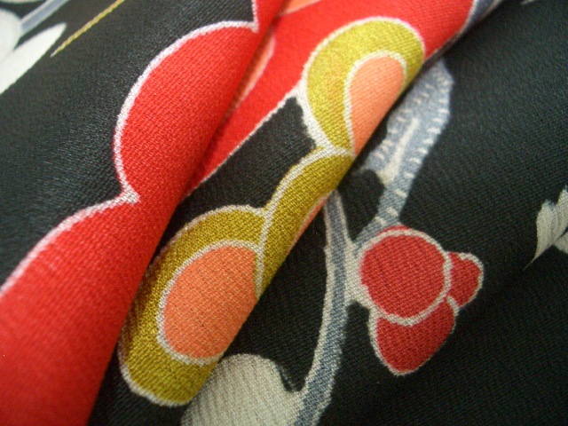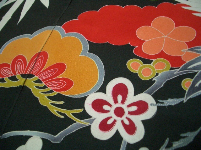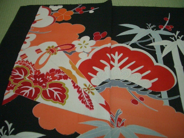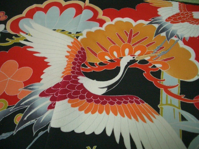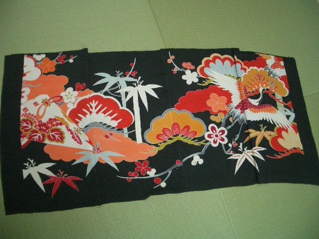古布正絹洗い張りの縮緬はぎれ黒地に鶴や松 220㎝ アンティーク昔着物リメイク古裂