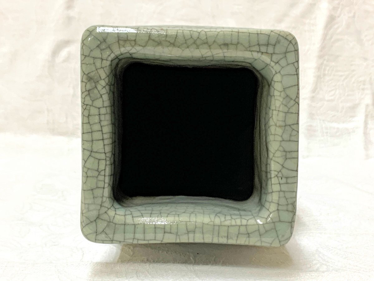 15162/ひび焼青磁 角花瓶 四方瓶 山水風景図 花器 中国美術 華道具 フラワーベース