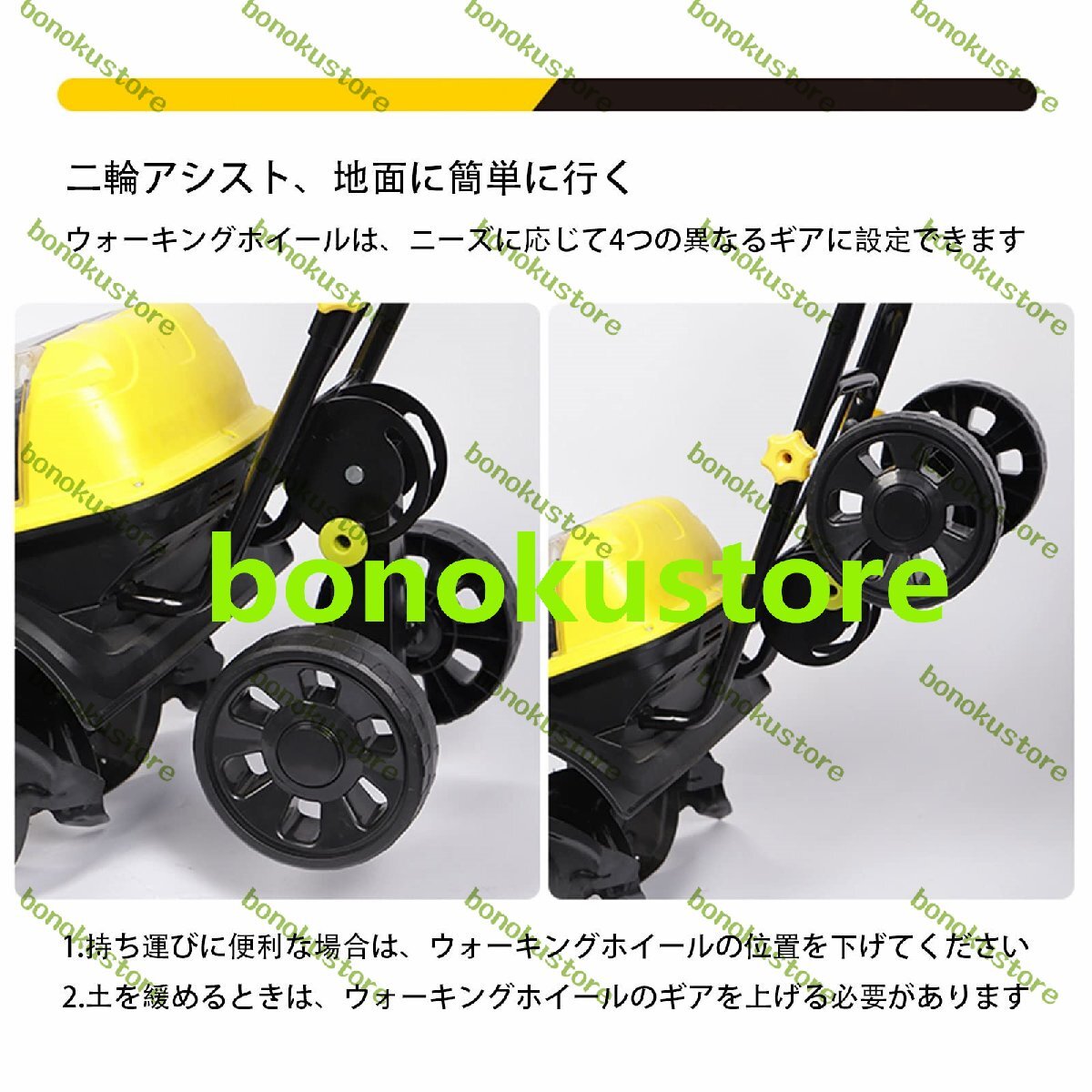 調整可能なローンレーキ:電動ロータリー耕うん機は、2つの補助ウォーキングホイールで設計されており、3つの異なるギアに設定して、ニーズに応じてタッチを減らすことができ、信頼性が高く、制御が簡単です。このユーザーフレンドリーなデザインは、ガーデニングを愛する人なら誰でも簡単にガーデニング作業に従事することができます!