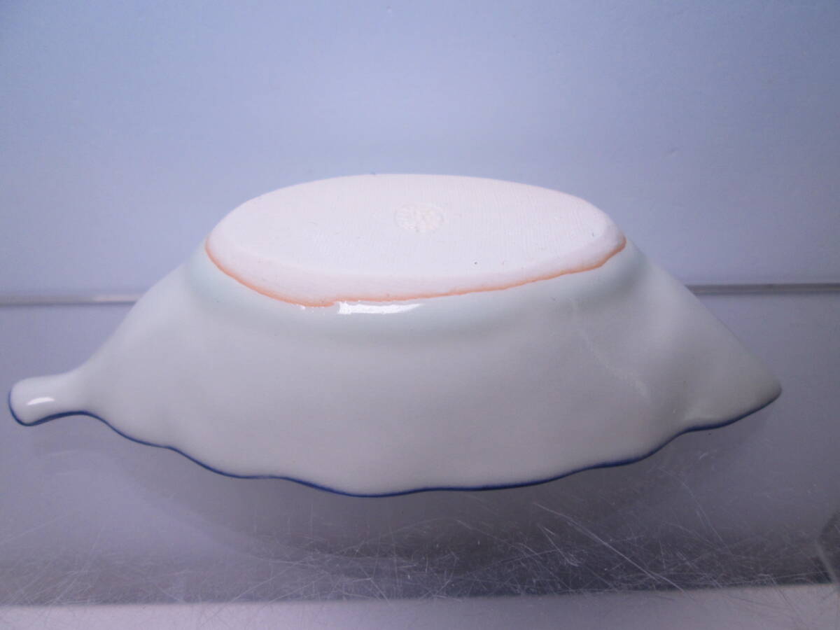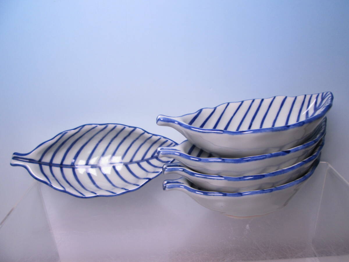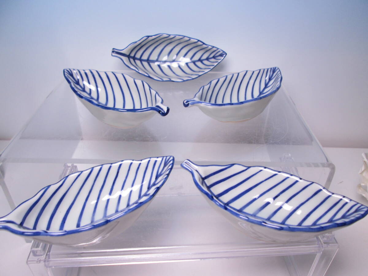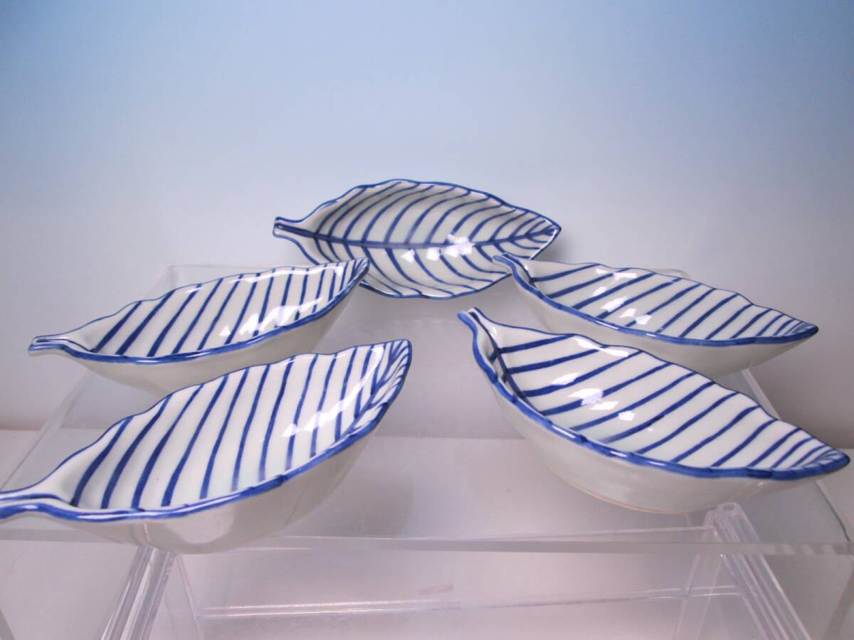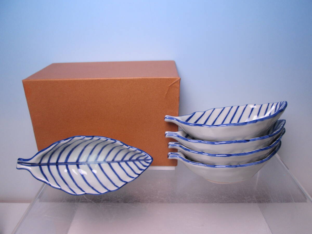☆お料理屋さんの器 清水焼 高木岩華 染付葉形の小向付 五客 箱付 小鉢/口取/小皿/懐石/割烹料理