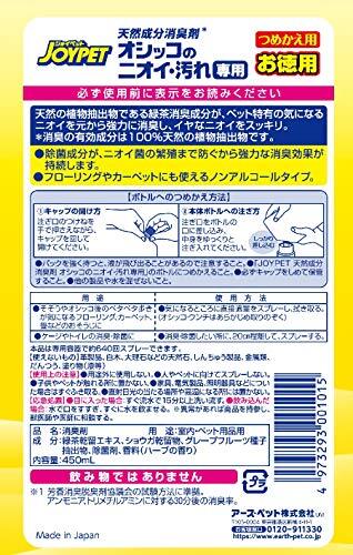 ・イエロー マルチカラー 白 450ml 4973293001015・・PatternName:450ml・100%天然の植物抽出液の消臭剤・原産国:日本・梱包サイズ:80.0 x 200.0 x 353.0 mm・ブラント名: JOYPET(ジョイペット)・メーカー名: アース・ペット商品紹介 ・天然の緑茶消臭成分※が、ペット特有の気になるオシッコやウンチ臭を元から強力に消臭します。※消臭の有効成分は100%天然の植物抽出物です。 ・なめても安心。 ・除菌成分配合なので、トイレやケージにも効果的。(全ての菌を除菌するわけではありません) ・すっきりハーブの香り。 ・フローリングやカーペットにも使えるノンアルコール。 <用途> ・そそうやオシッコ後のペタペタ歩きが気になるフローリング、カーペット、畳などのおそうじに ・ケージやトイレの消臭、除菌に 使用上の注意 用途以外に使用しないで下さい。 原材料・成分 緑茶乾留エキス、ショウガ乾留物、グレープフルーツ種子抽出物、除菌剤、香料 使用方法 用途以外には使用しないこと。幼児の手の届くところに置かないこと。