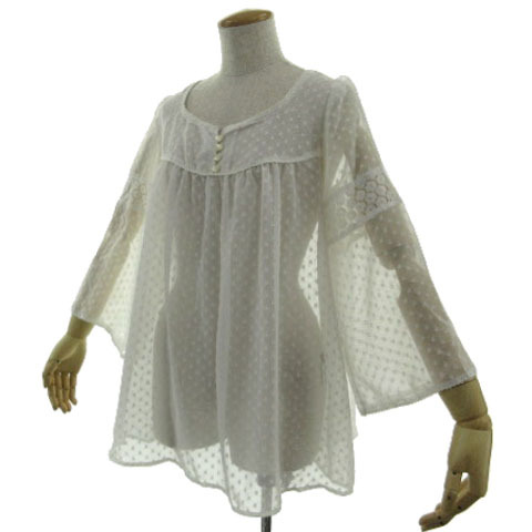【仕様】ブラウス シアーシャツ ヘンリーネック 七分袖 フレアスリーブ レース切替え シースルー 刺繍ドット 品番2113-84009 5106091-00