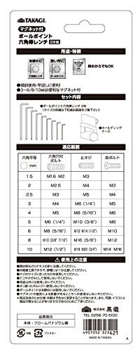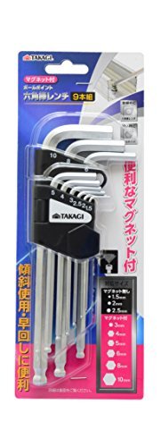 「高儀 六角棒レンチセット マグネット付 9本組」▼4907052323421▼(商品説明)マグネット付・グレー 4907052323421・・Style:マグネット付・製造国:台湾・本体:クロームバナジウム鋼・セット内容:ボールポイント六角棒レンチ9本、ホールディングケース×1・対応サイズ:1.5・2・2.5・3・4・5・6・8・10mm・便利なマグネット付(3・4・5・6・8・10mm)傾斜使用・早回しに便利 便利なマグネット付(3/4/5/6/8/10mm) 六角棒レンチで本締めに ボールポイントで狭い所に 斜めからでもOK
