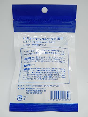 「ビルバック (Virbac) C.E.T.デンタルブラシ ミニ 3本」▼4535023303396▼(商品説明)・白 3本 303396・本体サイズ (幅X奥行X高さ) :8.5×1.5×14cm・本体重量:0.018kg・原産国:アメリカ合衆国説明 ヘッドが小さく、やわらかい毛が特長のデンタルブラシです。小型犬・猫の歯みがきに適しています。
