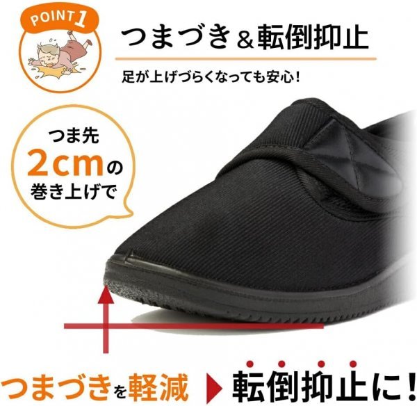 (1)つまづき&転倒防止 足が上げづらくなっても安心! つま先2cmの巻き上げでつまづきを軽減し、転倒防止に