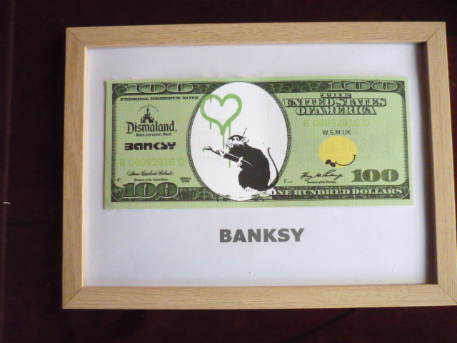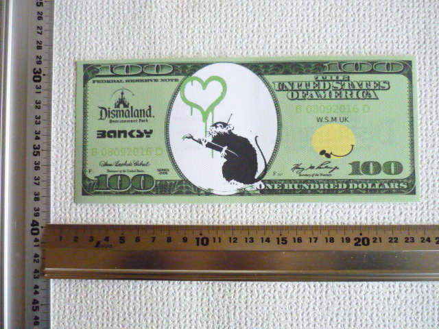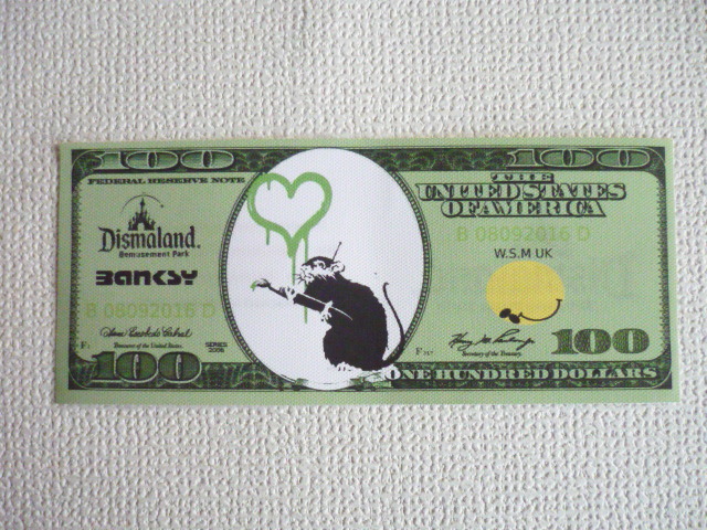 バンクシー Banksy (Banksy Dismaland ) 作品タイトル → ディズマル紙幣 100ドル 一枚の出品です。 ↓ ※ 100ドルのサイズ ↓約 約22.5 cm x 約9.5 cm 厚さ約 1mm ↓ ★出品の作品は、キャンバス生地です。 生地は柔らかい素材で掲載写真は丸まって見えたり、 曲がって見えますが額に入れますと綺麗になります。 ホテル内の倉庫を整理中に偶然見つけた ディズマル紙幣 です。(下記参照) BANKSYサイン入り ★未使用 ★本物保証