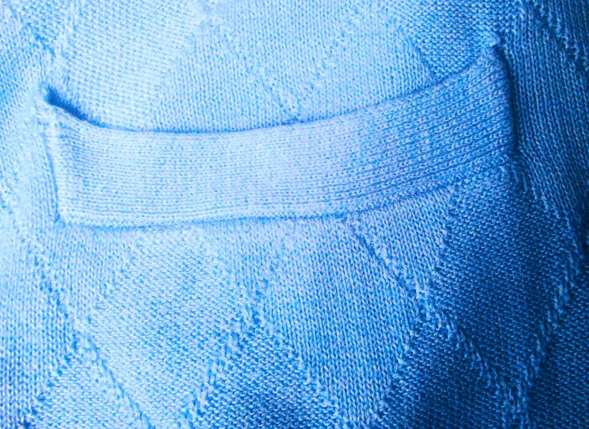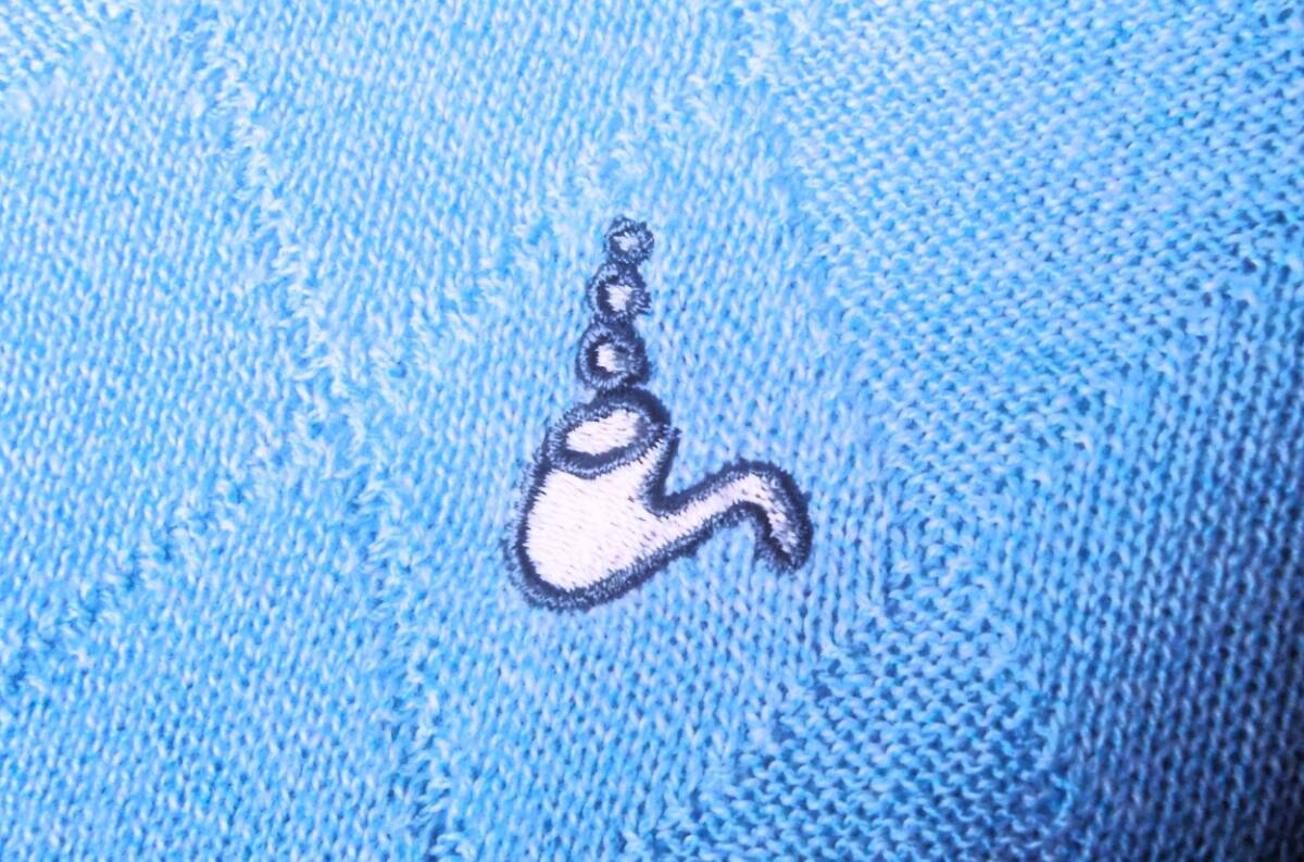 スカイブルーが爽やかなTOROYトロイ、ワンポイント刺繍ロゴ入りVネック ボタンアップ ポケット付きニットベストです。