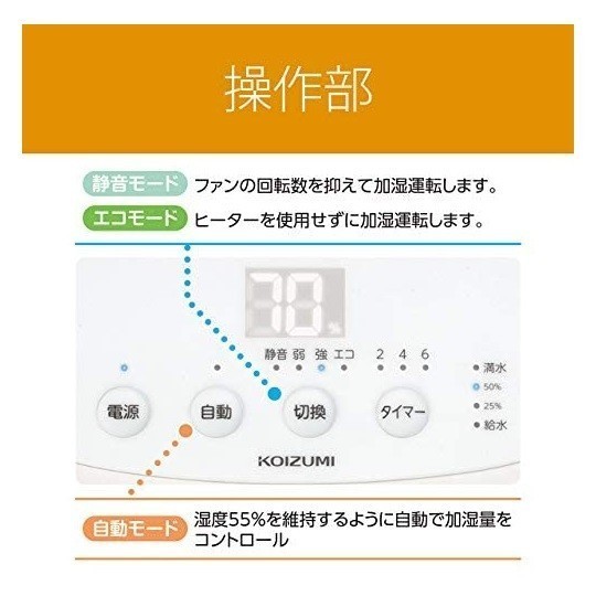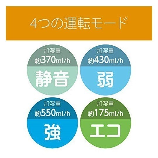 ・加湿能力(mL/h):静音 370/390mL/h、弱 430/450mL/h、強 530/550mL/h、エコ 190/180mL/h