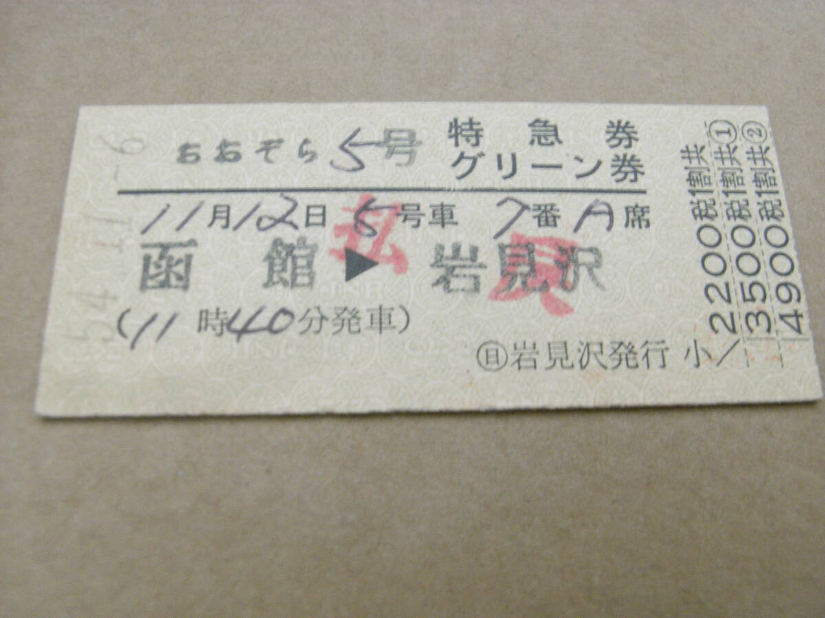 おおぞら5号 特急券 グリーン券 函館→岩見沢  昭和54年11月6日 日 岩見沢発行 国鉄