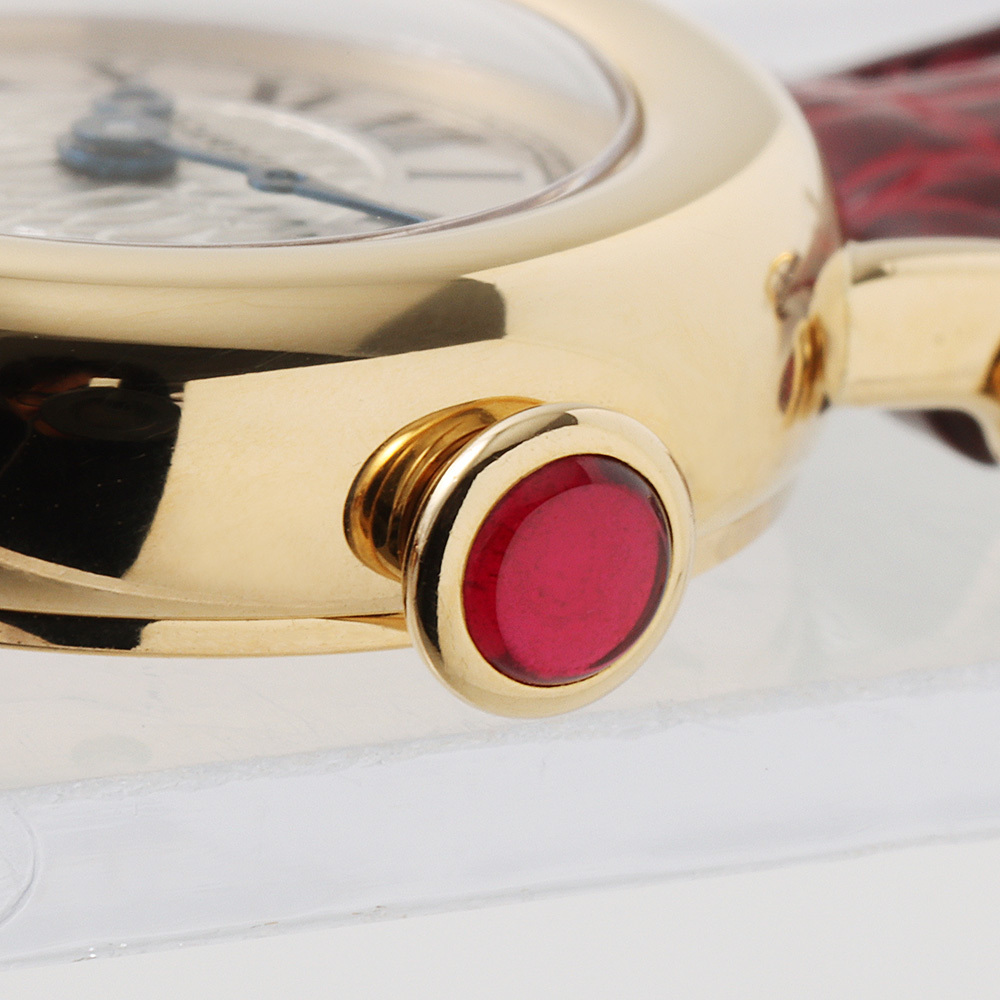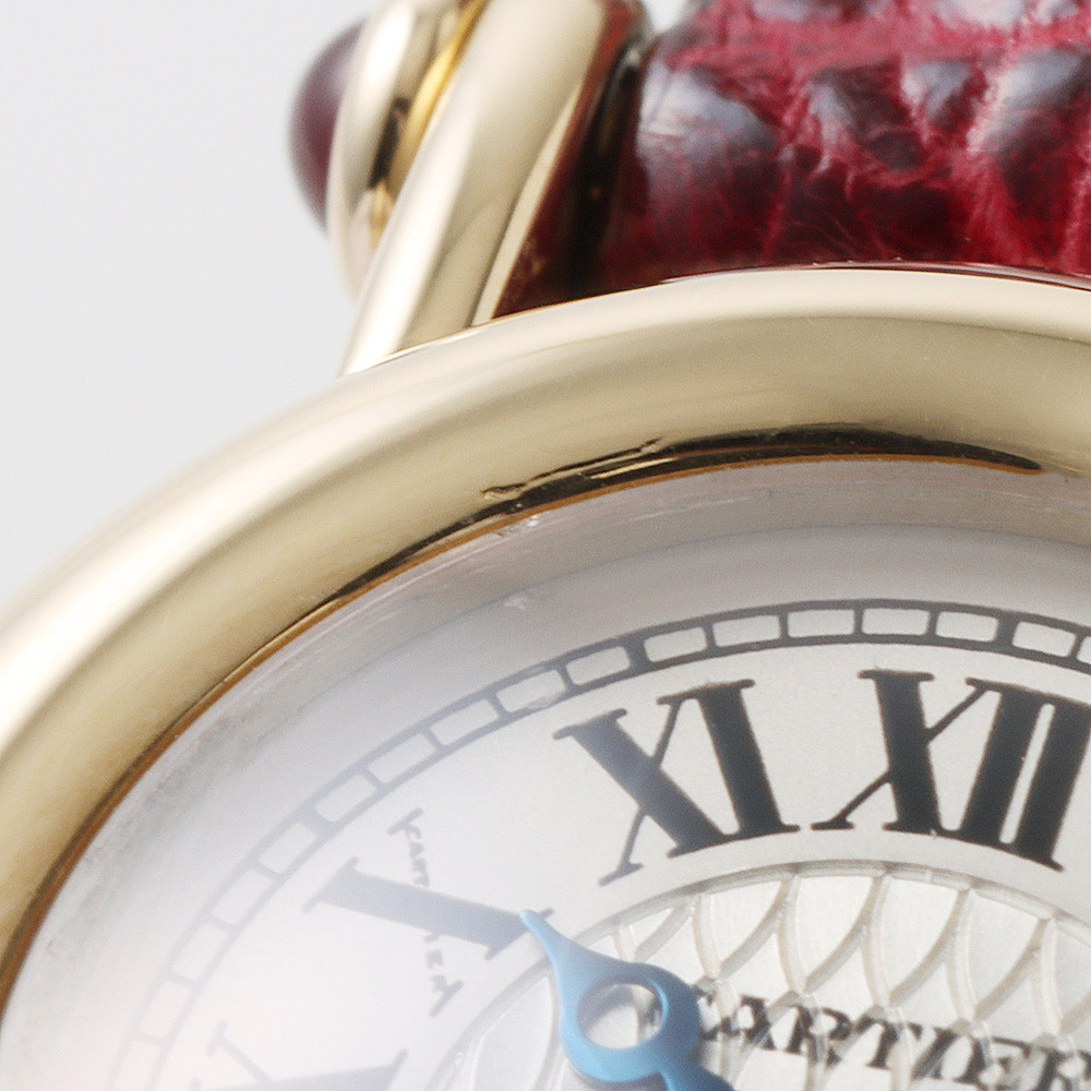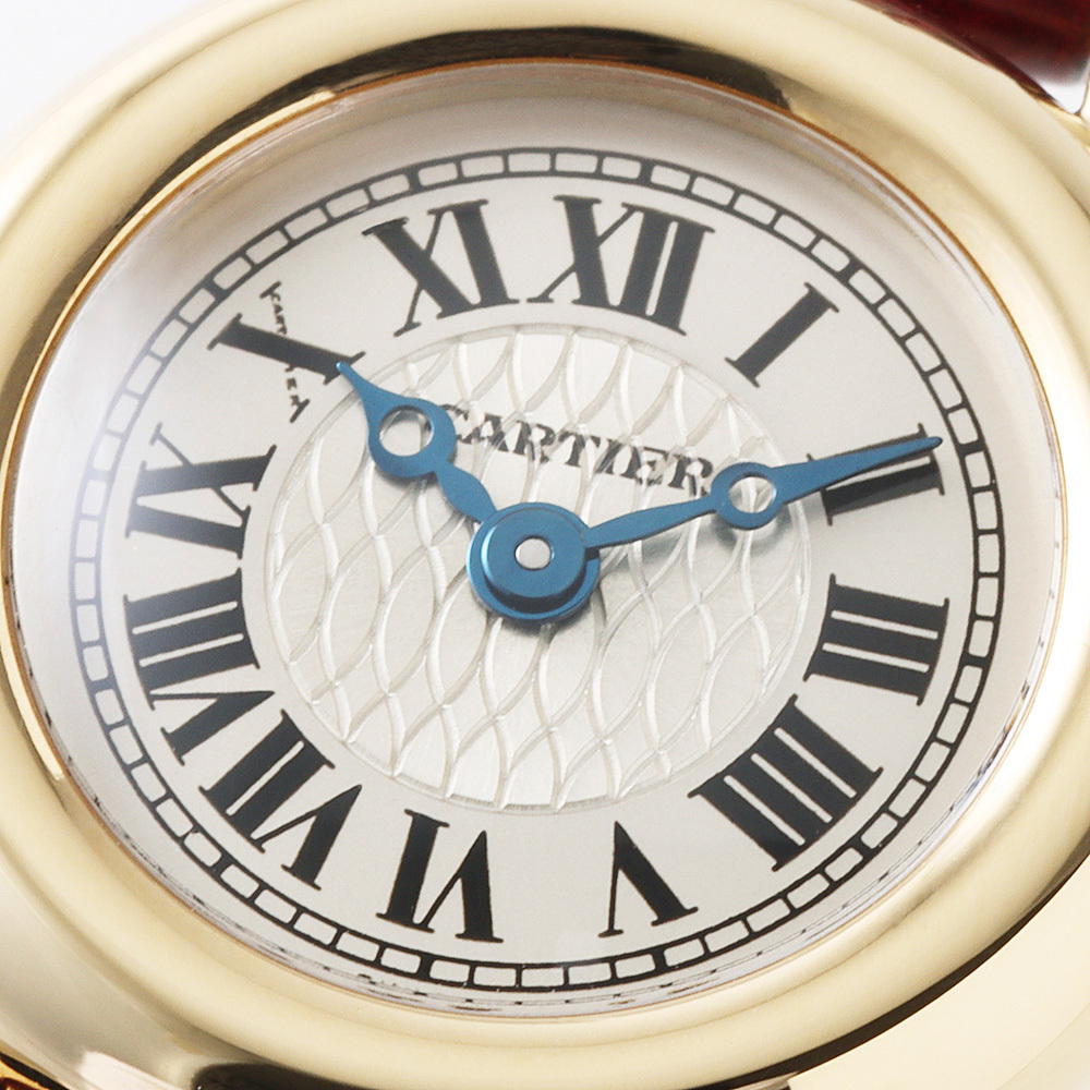 モデル情報 | “ディアボロ”とはフランス語で「空中コマ」を意味し、そのフォルムがイエローゴールドのケースデザインに反映されています。ラグとカボションに埋め込まれた5つのルビーとダイアル中央の美しい模様により、小ぶりながらも華やかさを感じさせます。ブレゲ針と呼ばれるデザインの針は、カルティエの中でも珍しいとされるディテールです。 |
