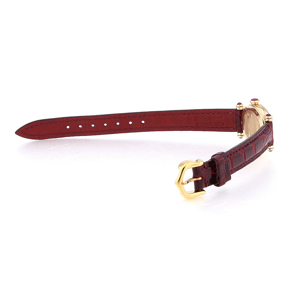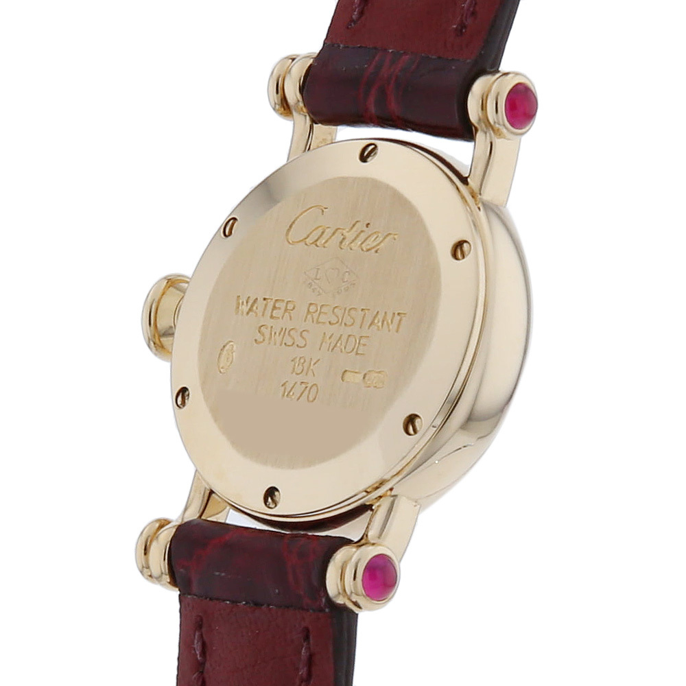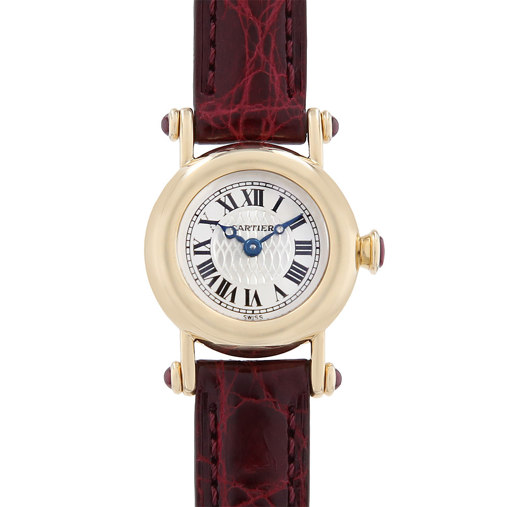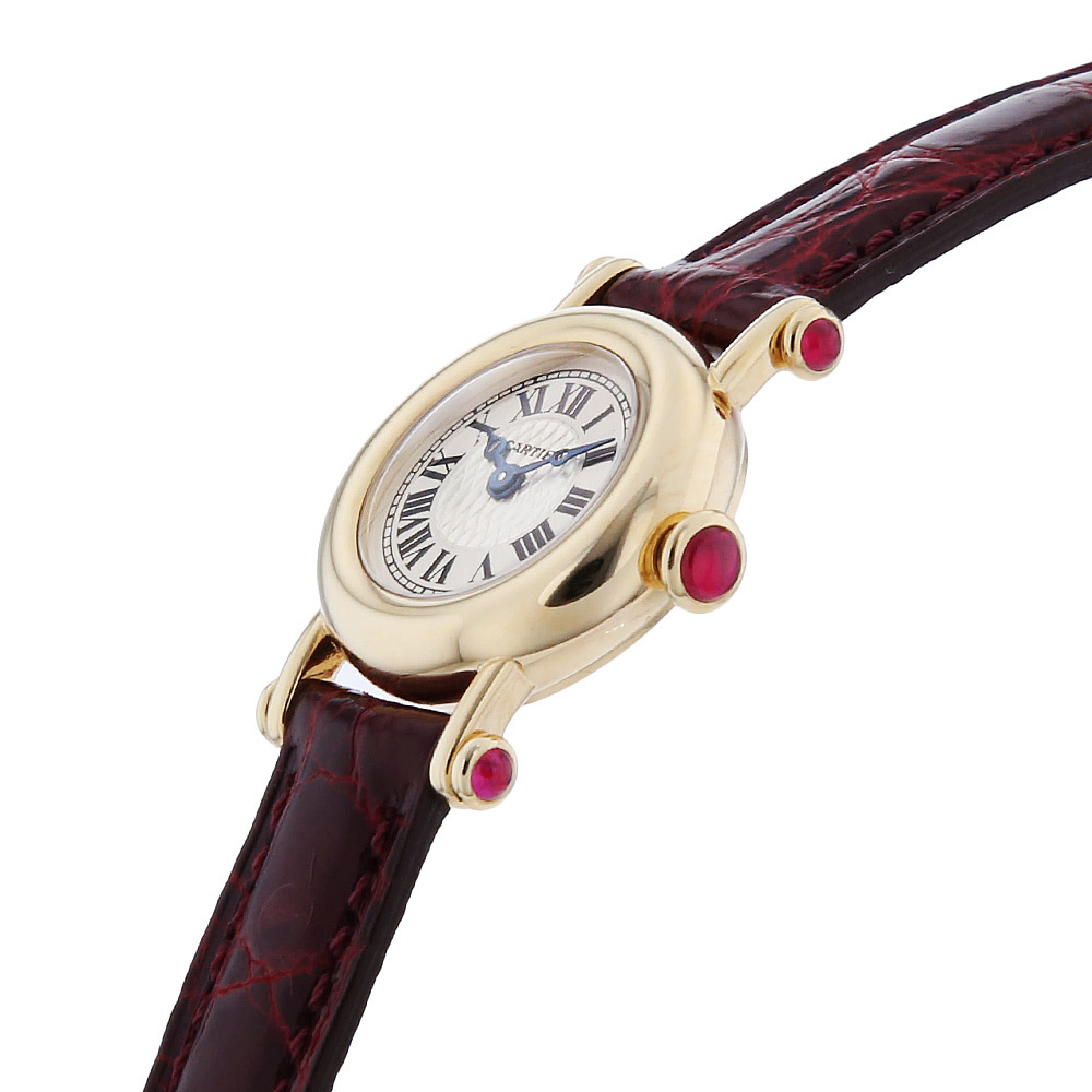 モデル情報 | “ディアボロ”とはフランス語で「空中コマ」を意味し、そのフォルムがイエローゴールドのケースデザインに反映されています。ラグとカボションに埋め込まれた5つのルビーとダイアル中央の美しい模様により、小ぶりながらも華やかさを感じさせます。ブレゲ針と呼ばれるデザインの針は、カルティエの中でも珍しいとされるディテールです。 |