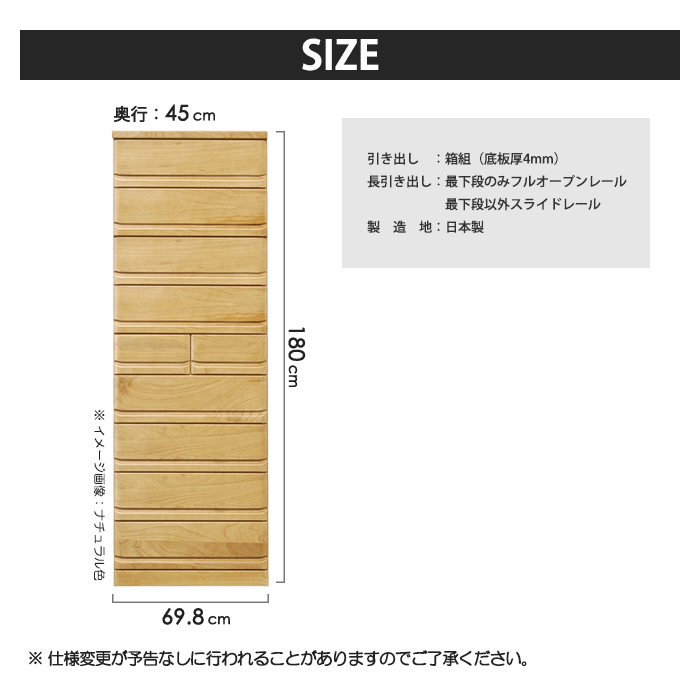 タワーチェスト 完成品 整理タンス 幅70cm 9段 リビングチェスト 木製 箱組 収納家具 洋服収納 日本製 国産 ブラウン