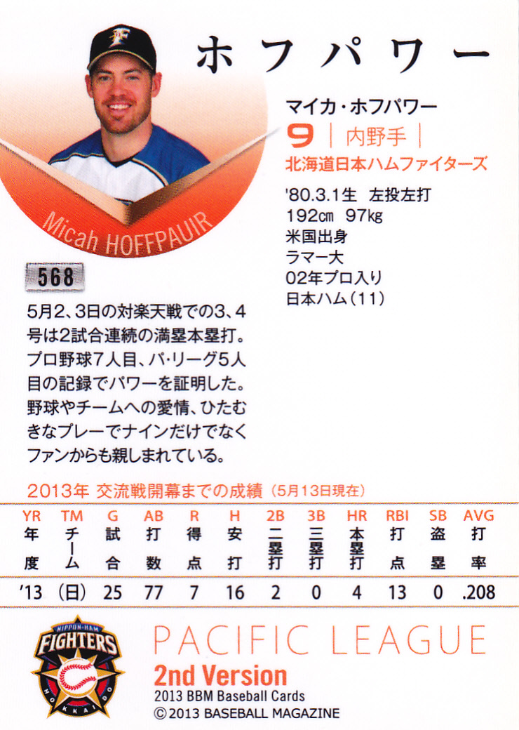 BBM2013ベースボールカード2nd 568 マイカ・ホフパワー アメリカ 北海道日本ハムファイターズ 助っ人