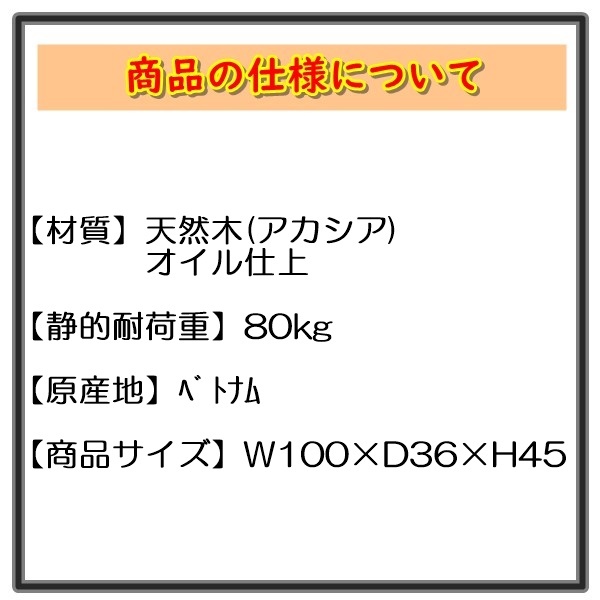 ![]() ベンチ BNC-719 商品の仕様について 【材質】天然木(アカシア) オイル仕上 【静的耐荷重】80kg 【原産地】ベトナム 【商品サイズ】W100×D36×H45 【組立】組立式 ◇◆発送について◆◇