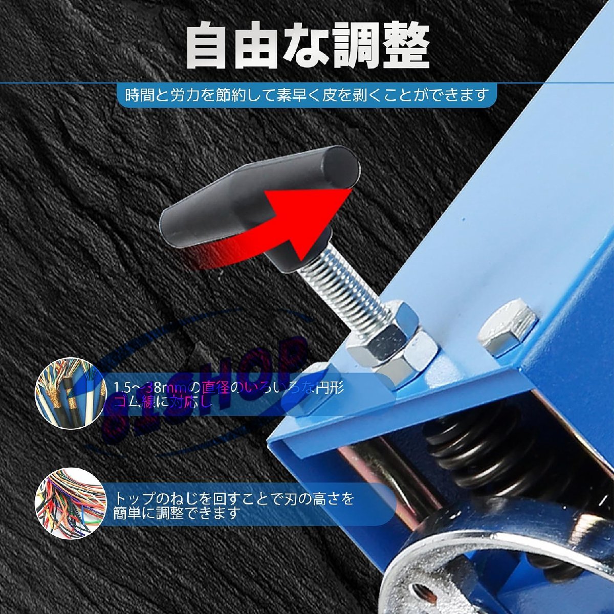 2.自由な調整:トップのねじを回すことで刃の高さを簡単に調整できます。1.5~38mmの直径のいろいろな円形ゴム線に対応し、時間と労力を節約して素早く皮を剥くことができます。