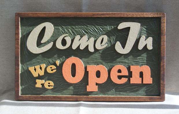 木製 看板「Come In We're Open」 ケヤキ 無垢板