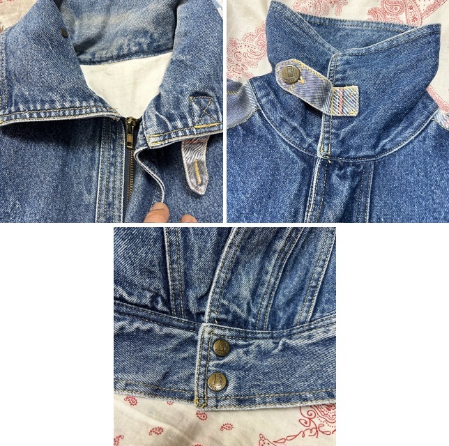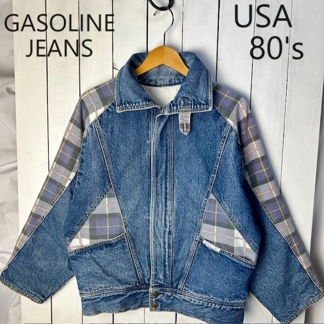 USA古着 80s チェック切替え チンスト付 ジップデニムジャケット L程度 オールド ヴィンテージ アメリカ古着 デニムブルゾン gasoline●63