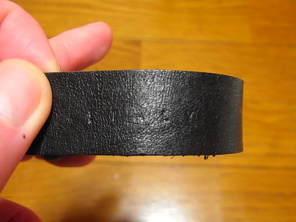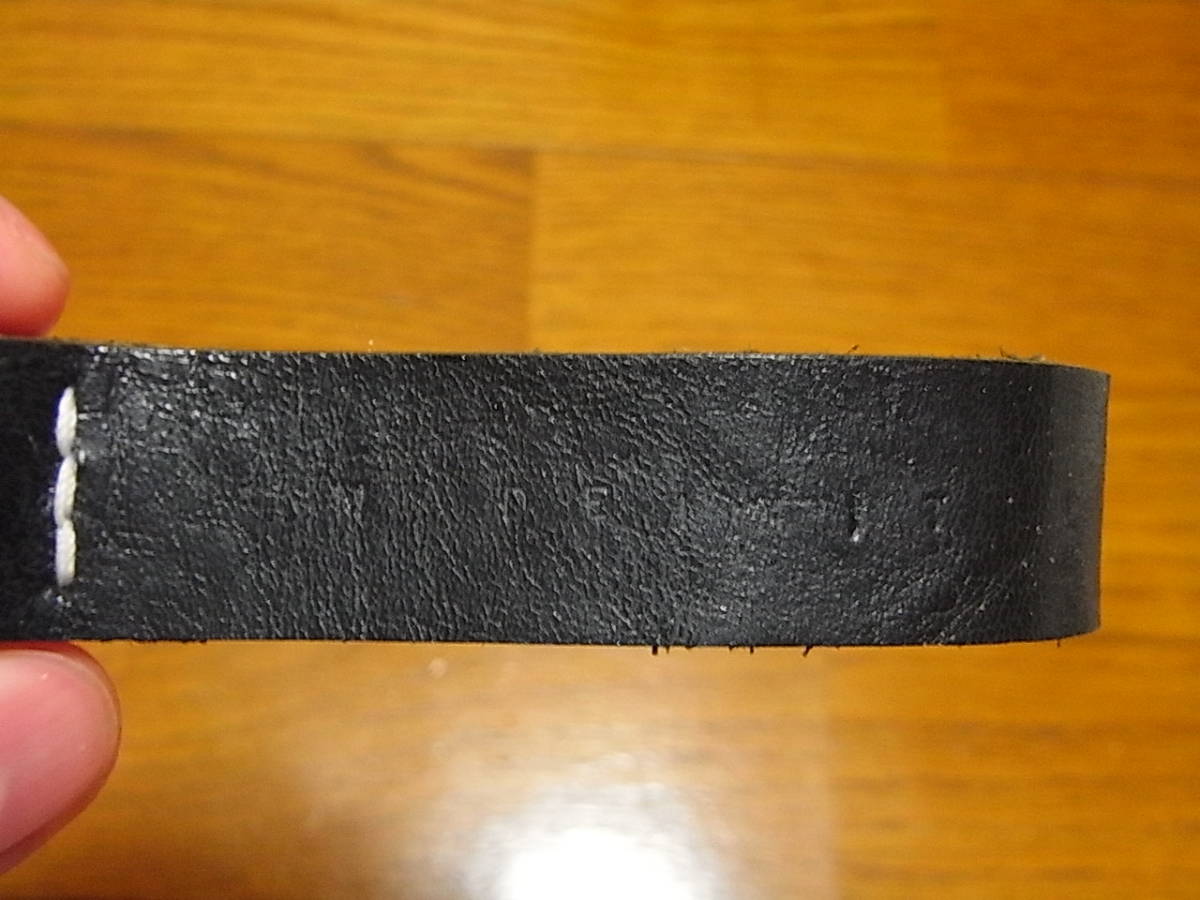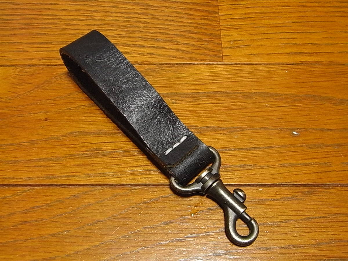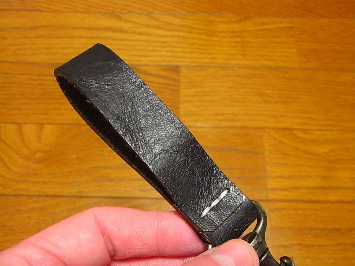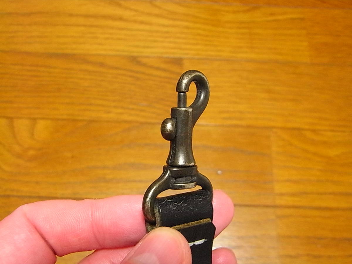 イタリア製、ナスカンは真鍮製に黒っぽいメッキのものレザーの色はブラック、レザーの厚み2.5mm、レザーの幅は20mm、長さは全長14cm、レザー部分の長さ10cmでした。薄くMADE IN ITALYの刻印あり(最初から薄かったです)。