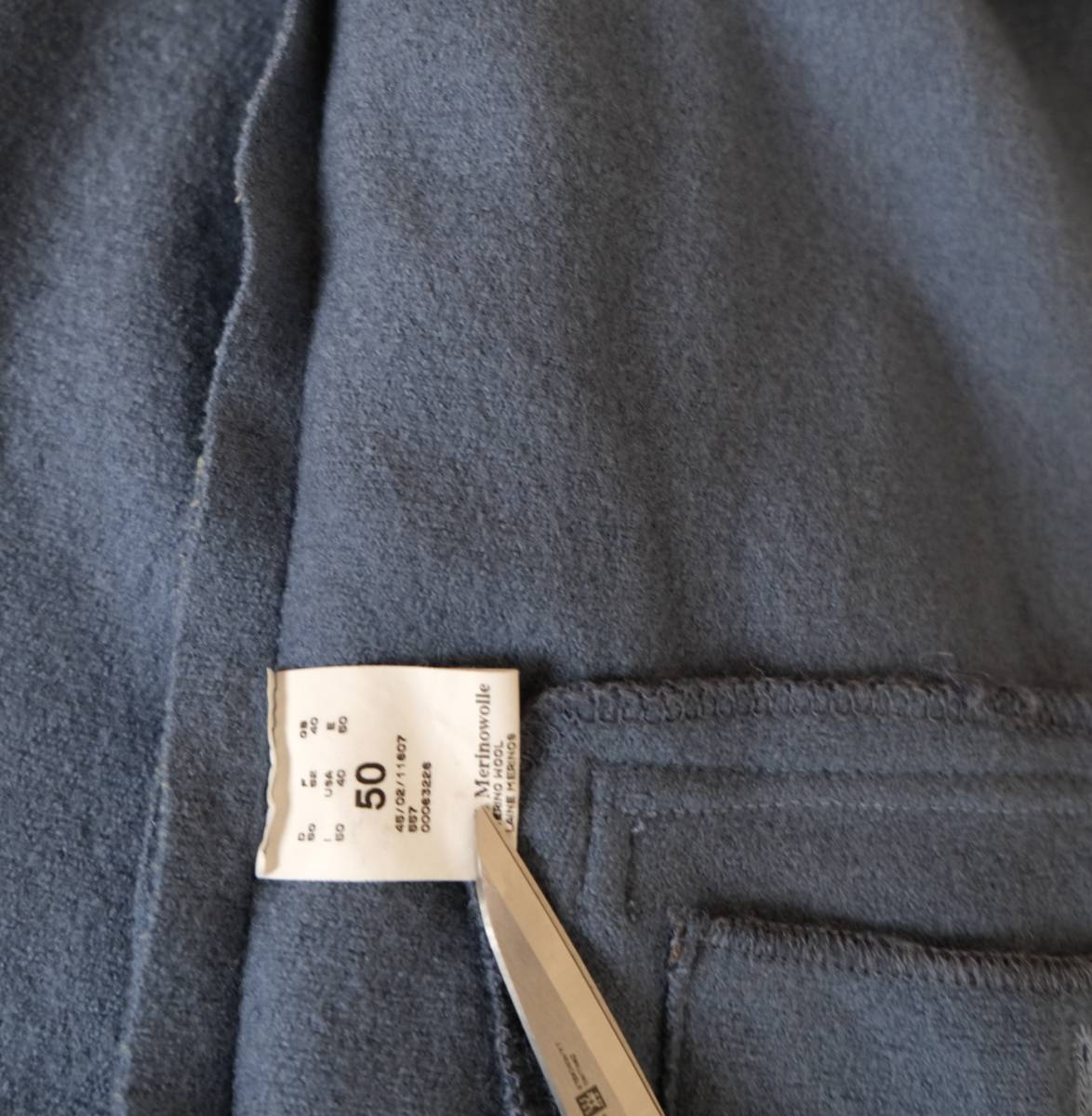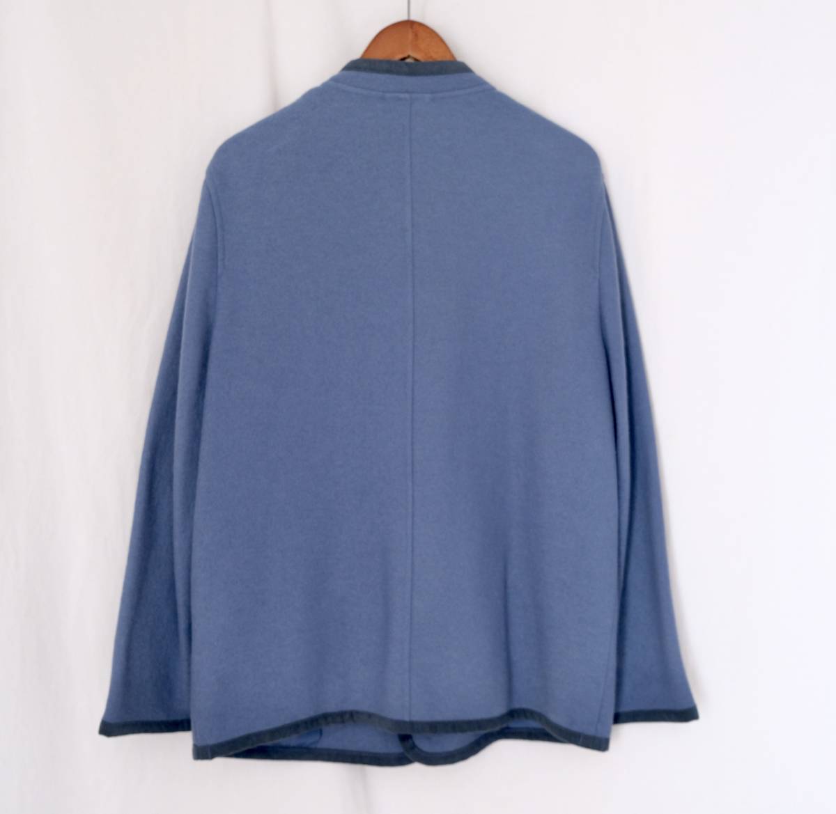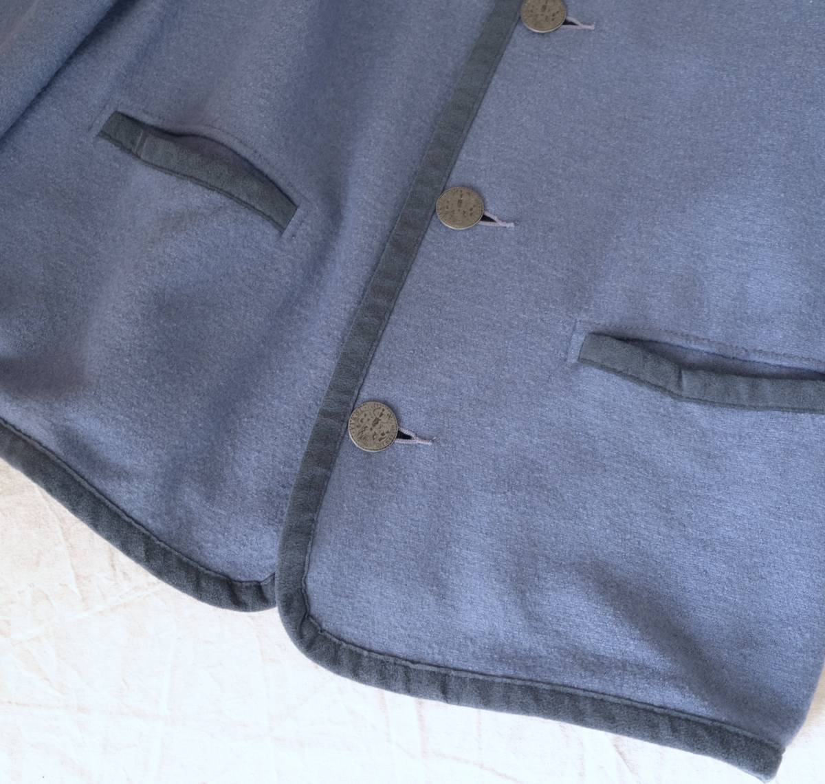 柔らかなボイルドウール素材を用い、刻印入りのメタルボタンやパイピングの
