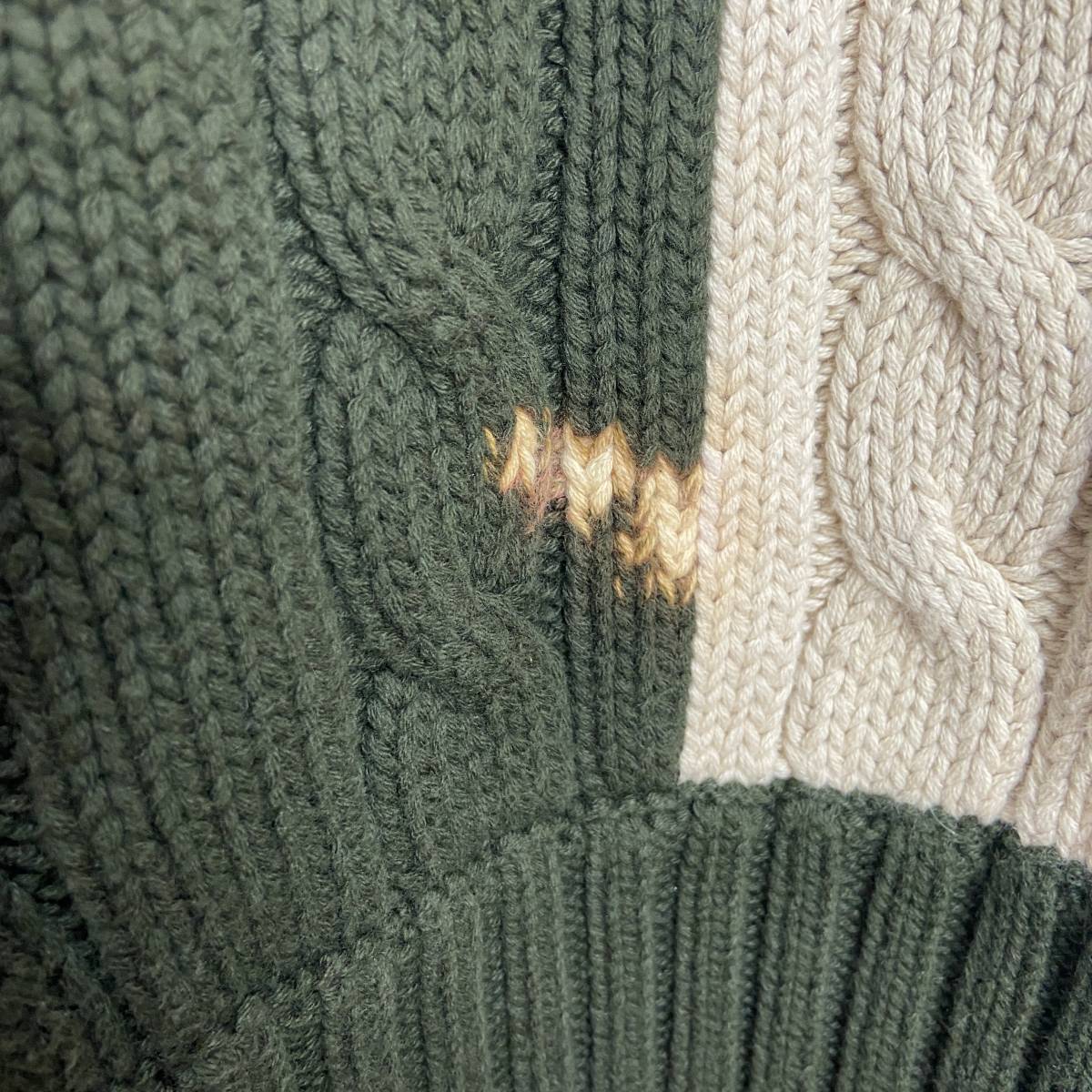 ストライプ状のクレイジーパターンカラーに、ケーブル編みデザインがとてもおしゃれです。