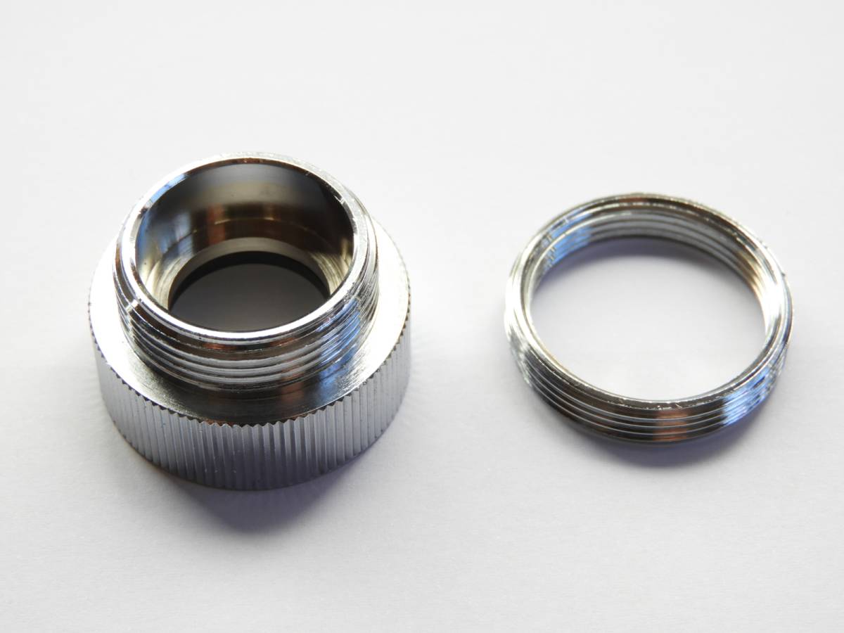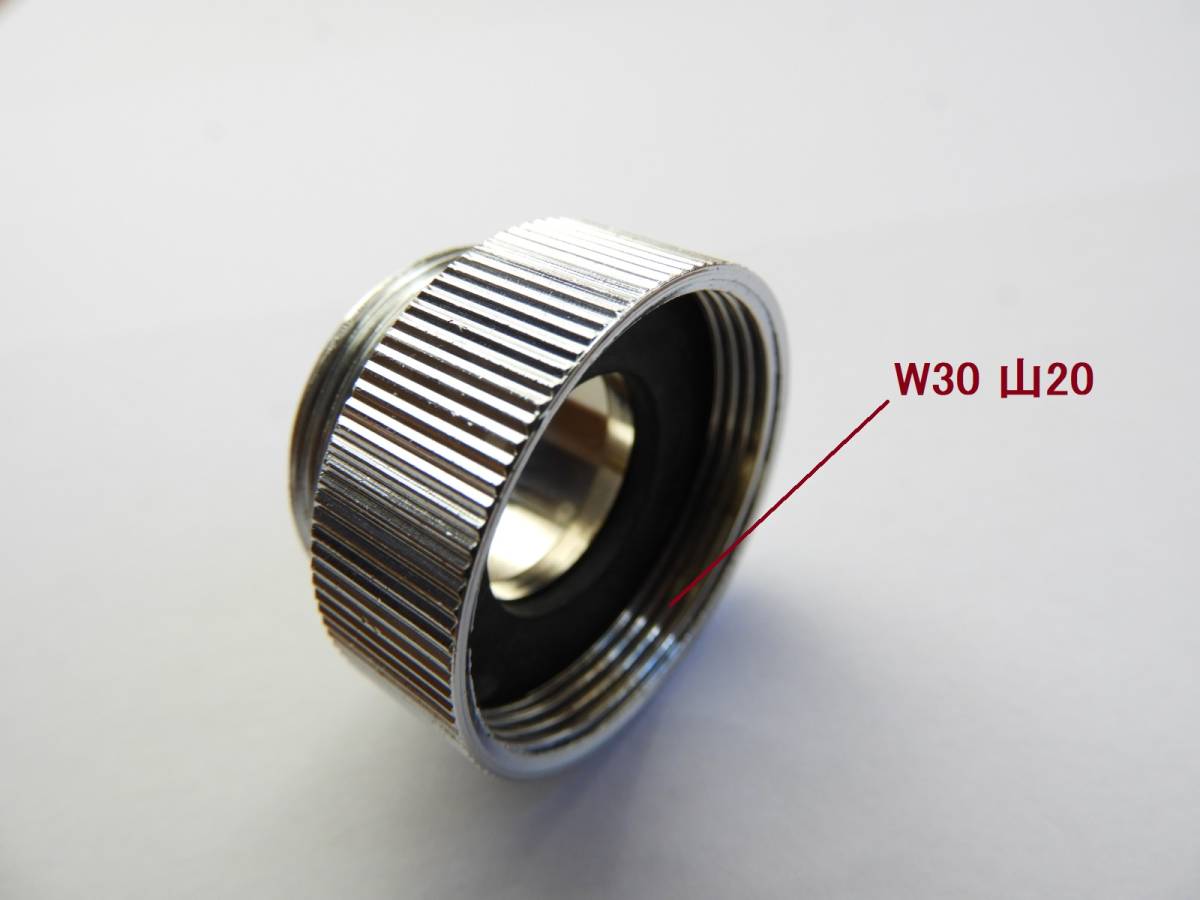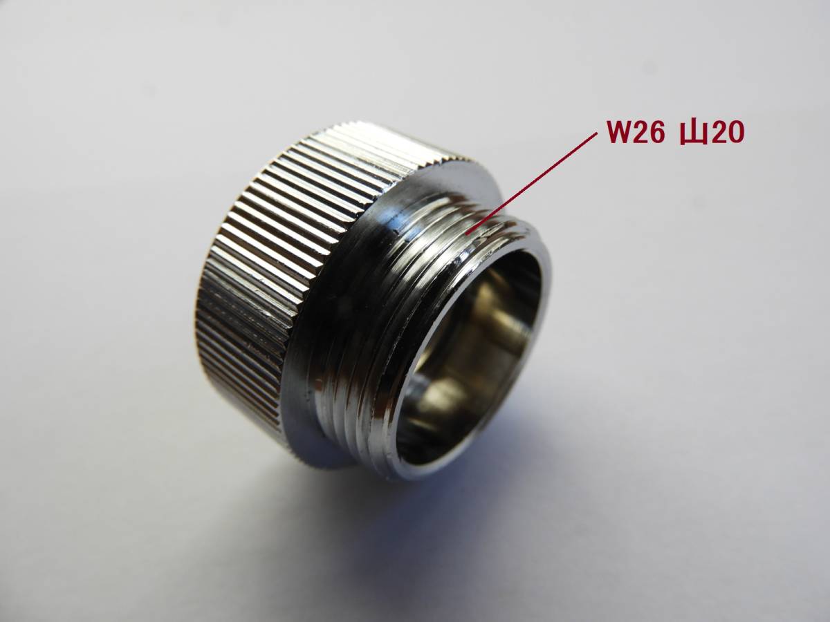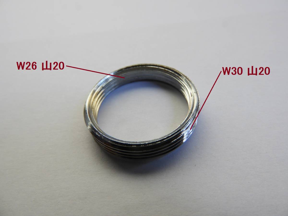 W30山20ネジ(自在水栓、混合栓の大口径パイプ:外径19ミリ)に外径16ミリ・W26山20ネジのパイプを取り付けるアダプターです。