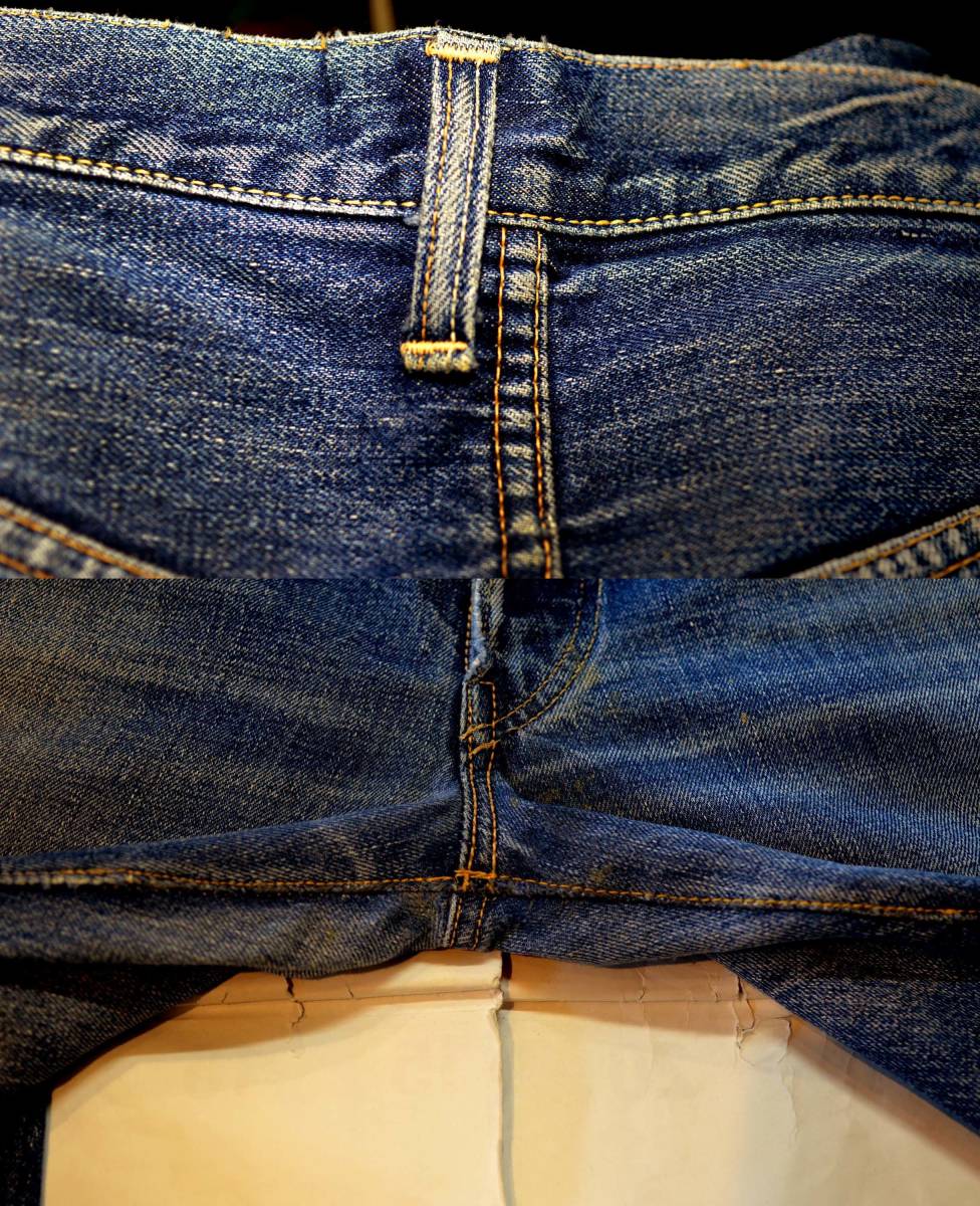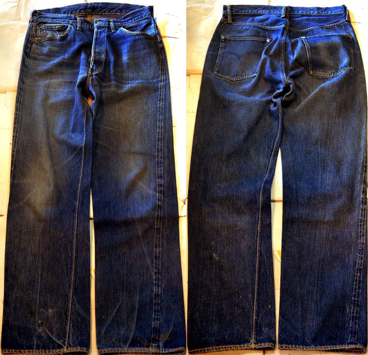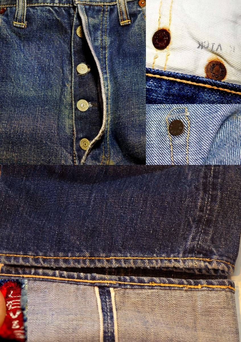 501XX革パッチ~ギャラ入り1950年代オリジナルです。復刻、レプリカではありません。『ディテール紹介』隠しリベット、ループズレ、フロントVステッチ、打ち抜きリベット、フロントトップボタン裏の刻印無、裾オリジナルチェーンステッチ、縫製は100%綿糸です。フライボタンは通常Rです。『状態』リペア=右前ポケ淵、股。股は気付かないレベルの非常に綺麗な解体リペアです。その他=スレ、キズ、ステッチのほつれ・補強などUSED感があります。生地はしっかりしています。『色落ち、特徴など』ゴールデンサイズの革パッチ~ギャラ入り501XXです。XX特有の非常に深みのあるインディゴで、キメの粗い縦落ちが全体に見られます。ヒゲや濃淡のメリハリも綺麗に出ており、膝下などは濃いめのインデイゴが残る、最高の落ち方です。サイド赤耳も完璧に開き、キャタピラ状の最高のアタリが出ております。芯にインディゴが残ったような独特の深みは、この年代ならでは。本当にスペシャルな抜群の色落ちです。サイズバランスも最高で、希少価値は大変高いと思います。