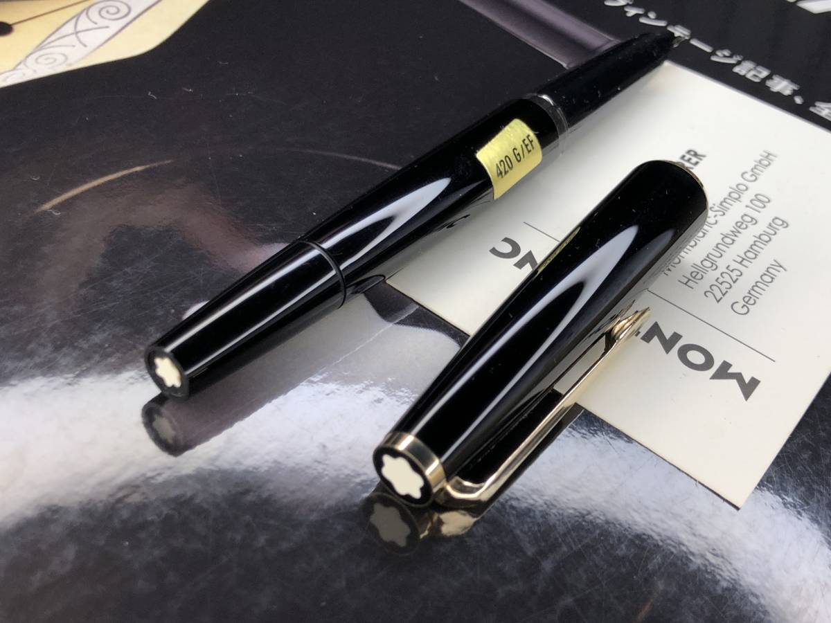 <【 出品の品の詳細 】>★※未使用に近い極上美品!ザ・パイオニア!No420GP・ブラック・カラー軸モンブラン社製の万年筆!&純正ボトルインクのセット・インクはミステリーブラック60ml双方共に未使用に近い★世界中でベストセラーとなった万年筆の基本中の基本モデルです★艶のある漆黒のブラック・カラーのモンブラン万年筆は魅力の逸品です!★1970年代のNo320モデルの後継モデルの稀少なピストン・フューラーモデルでがボトルインクより手軽にインク吸引が楽しめる、ペン先の形状はモンブラン・カレラ・モデル同タイプで柔らかで柔軟性のある万能タイプでトリッジインクとコンバーターの装着が可能なモデルが出現して万年筆は画期的進化をしました、1970年代の世界のベストセラーモデルとなったNo320の後継モデルにしてピストン・フュラー・モデルは1970年〜1974年までの製造の稀少なモデルとして発売されたNo420GPは、キャップ部のゴールドの1リングとゴールドの585のペン先は、サイズです、更により手軽で扱いやすいモデルとして人気の高いスタンダードモデルです、現在モンブラン愛好家やモンブランを使用したい方、収集を始めた方にお薦めのザ・パイオニア・モデルのモンブランの気軽に買えるヴィンテージモデルですが、1970年代のヴィンテージモデルとして50年を超えるヴィンテージモデルであり、ペン先は柔らかくとても書き易いしなやかなペン先を持っています★パイオニア・モデルでヴィンテージ・モデルであり実際に現在綺麗な状態で現在維持している綺麗な状態の品は少なく、使用頻度が少なくて、外観も傷みの少ない品を探すのは難しいです、こちらの品は内外共にとても綺麗な状態で保管されていた美品で未使用に近い試し書きのみの美品です、実際に見つけて来るのは難しく、購入するのであれば綺麗な状態のコンディションの好い品が欲しいと思うのは誰もが抱く希望です、ブラック・カラーの艶のあるボディ軸と綺麗なゴールドプレートの金装飾は美しくモンブラン万年筆のザ・スタンダードです!★ペン先のサイズはFと思われます★未使用に近い極上の綺麗な品ですがヴィンテージモデルのused品としまして個人の自宅による長期の保管品としまして微細な傷みやスレなどは経年品としまして、ご了承ください※撮影時ペン本体に保管時の布ほこりなどはご了承ください★万年筆本体のみの出品です、インク装着や取り扱いなどの為に参考資料を同封させていただきます★経年のほんの微細なスレや傷みなどはご了承ください★※他でもお話ししています為、完売の際はご容赦ください※ ※※ ★※最近品物到着後に受け取り完了の手続きをしない方、忘れる方が増えています、受け取り完了の手続きをしなければ取引が成立しない為、品物受け取り、品物が配達済みの場合は到着より24時間以内に(受け取り完了)のお手続きをお約束出来る方限定でお願いします、品物が配達済みで品物を入手しているのに、受け取り完了の手続きをしなければ代金は出品者に送金されない為、受取完了手続きは落札者のルール義務違反です※保護梱包を施しパッケージを荷造りして遠くの郵便局まで発送しに行きますことから、品物が届き受け取り後には速やかに受け取り完了の手続きをお願いします※★ ★※落札後24時間以内に取引ナビより連絡いただくか、お取引ナビより購入お手続きや落札者様の発送先詳細の連絡と落札後48時間以内のお支払いお手続きや購入お手続きを出来る方のご入札をお願いします、お約束を守れない方の入札はしないようお願いいたします※★上記のお約束をお守りいただけないルール違反や悪質な方、トラブルを起こす、連絡などする方は取り消し対応やと記載の評価をさせていただきます事をご留意ご了承ください※★ ※受け取り後の返品や交換には対応していません、最近一部パーツの除去や剥ぎ取り、すり替えなどのトラブル防止の為、ご対応をしておりません、購入後、受け取り後の値引き要求や気軽な気持ちでの交換や返品受付の対応は出来ませんのでご留意ご了承ください※ ※※★※最近品物到着後に受け取り完了の手続きをしない方、忘れる方が増えています、受け取り完了の手続きをしなければ取引が成立しない為、品物受け取り、品物が配達済みの場合は到着より24時間以内に(受け取り完了)のお手続きをお約束出来る方限定でお願いします、品物が配達済みで品物を入手しているのに、受け取り完了の手続きをしなければ代金は出品者に送金されない為、受取完了手続きは落札者のルール義務違反です※保護梱包を施しパッケージを荷造りして遠くの郵便局まで発送しに行きますことから、品物が届き受け取り後には速やかに受け取り完了の手続きをお願いします※★ ★※落札後24時間以内に取引ナビより連絡いただくか、お取引ナビより購入お手続きや落札者様の発送先詳細の連絡と落札後48時間以内のお支払いお手続きや購入お手続きを出来る方のご入札を