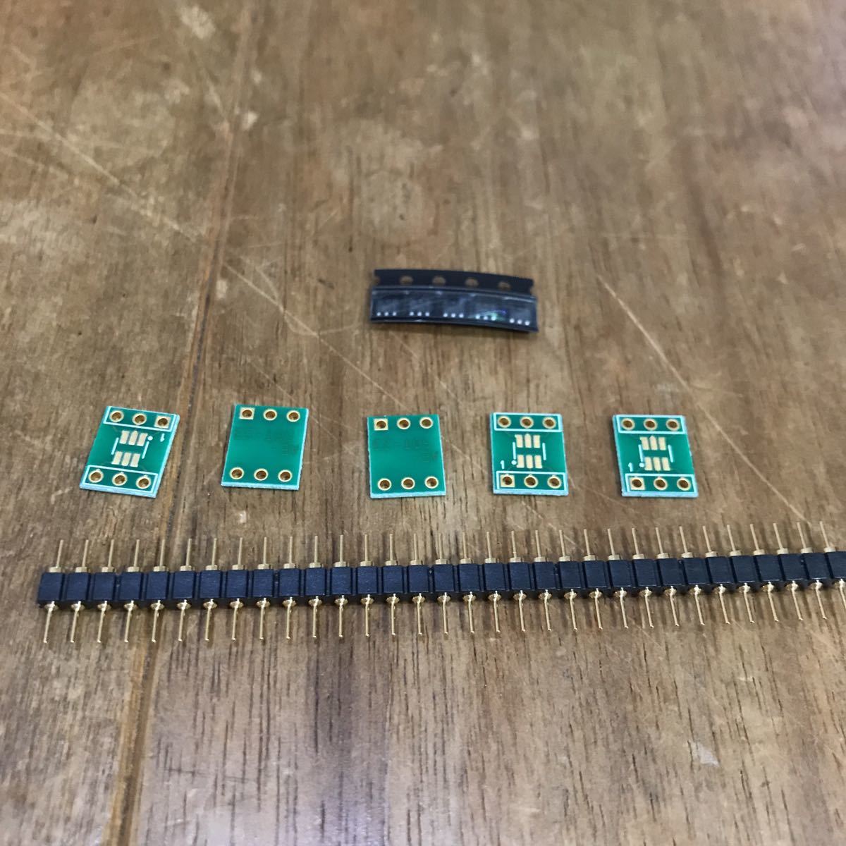 表面実装のSOT-23パッケージのため、ユニバーサル基板で使用できるよう、変換基板とピンソケットもお付けします。