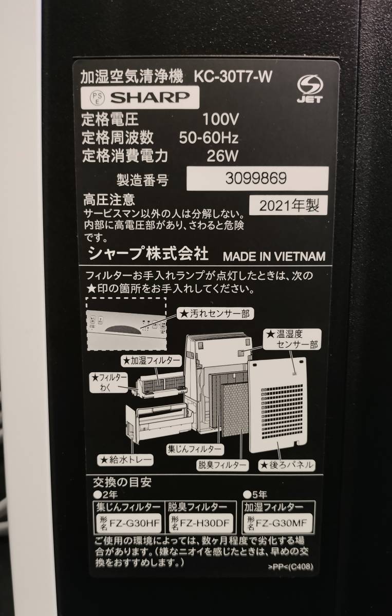 美品■シャープ■加湿空気清浄機 プラズマクラスター 2021年製 KC-30T7-W ホワイト 愛知近郊・配送★引き取り歓迎★