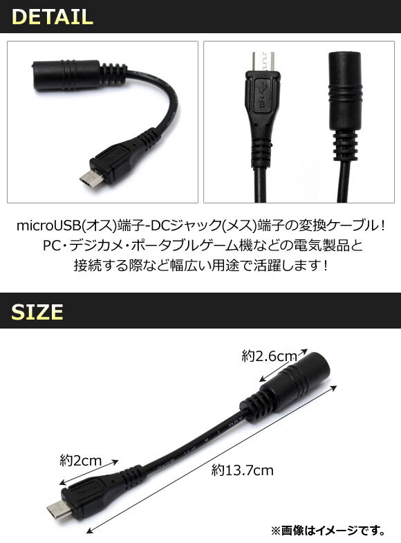 サイズ/タイプ:MicroUSB(オス)-DCジャック(メス) 外径5.5mm内径2.1mm