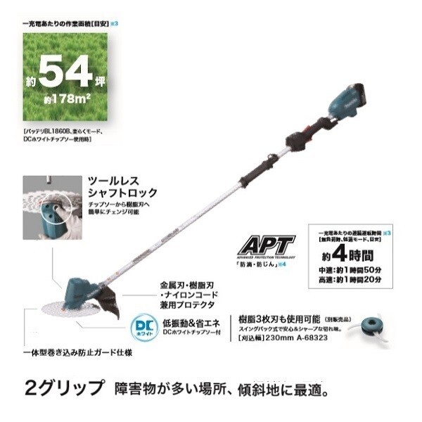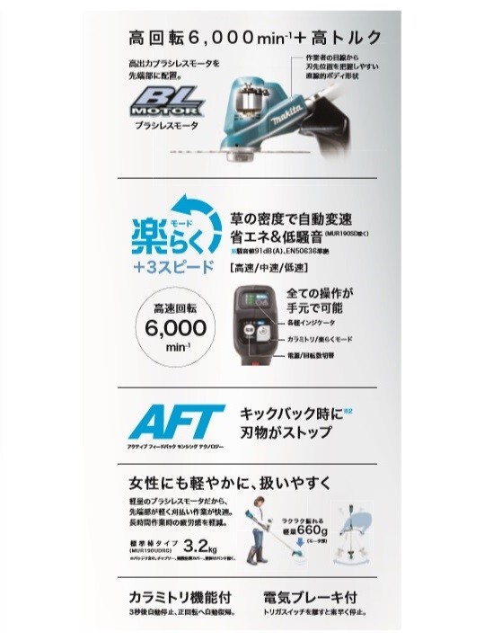 軽量のブラシレスモータだから、先端部が軽く刈払い作業が快適。