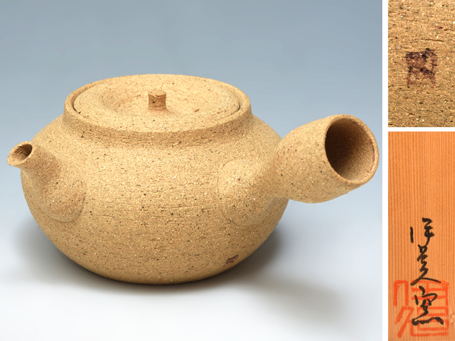 伊呂久窯 森伊呂久 (造) 萬古焼湯沸です。 温かみの感じるやや粗い土味の肌が特徴的な一品です。 持ち手付近に銘あり。 目立ったダメージはなくコンディションは良好です。 ※撮影の際に生じた写り込みなどがございます。 ご理解の程よろしくお願い致します。 |
