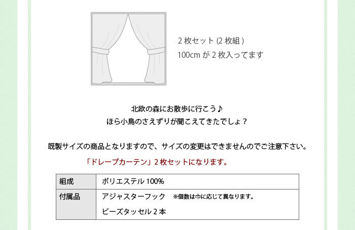 | 種類 | 森の柄カーテン2枚セット アジャスターフック&ビーズタッセル付 |