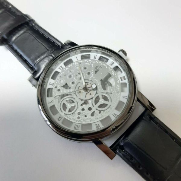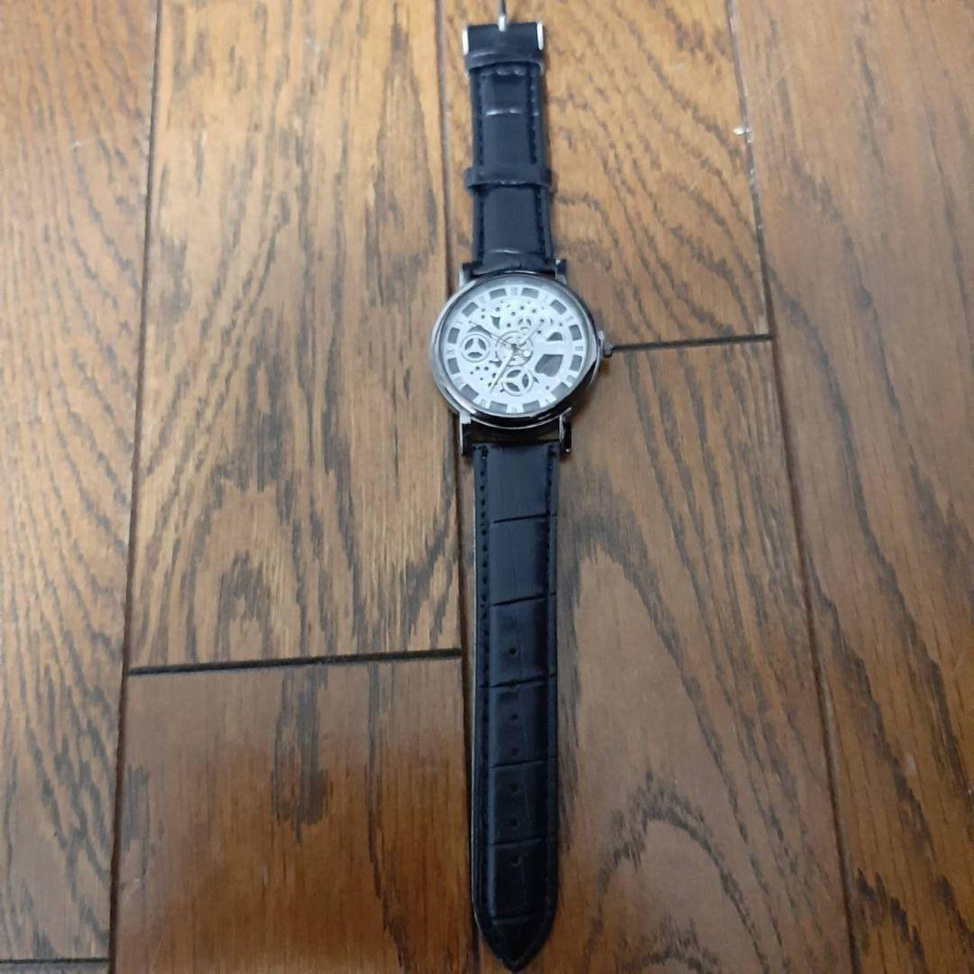 新品 未使用 スケルトン メンズ 腕時計 アナログ 黒シルバー ウォッチ デザイン レザー風 ストラップ 時計 レディース 腕時計