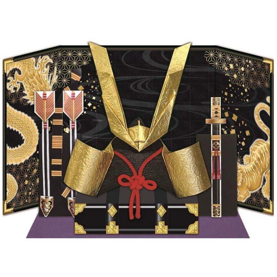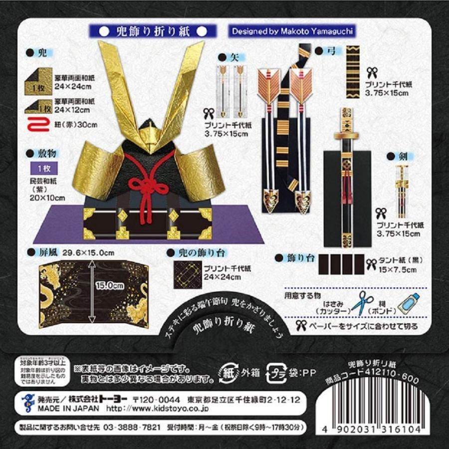 【セット内容】豪華両面和紙(24×24cm、24×12cm):各1枚、紐(赤)30cm、民芸和紙(紫)、屏風、タント紙(黒)、プリント千代紙(矢、弓、剣、兜の飾り台)、折り方テキスト