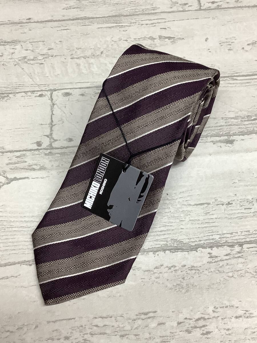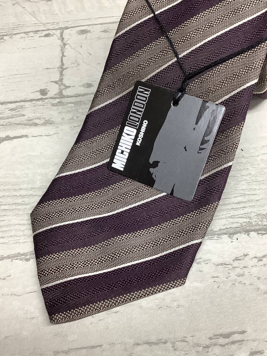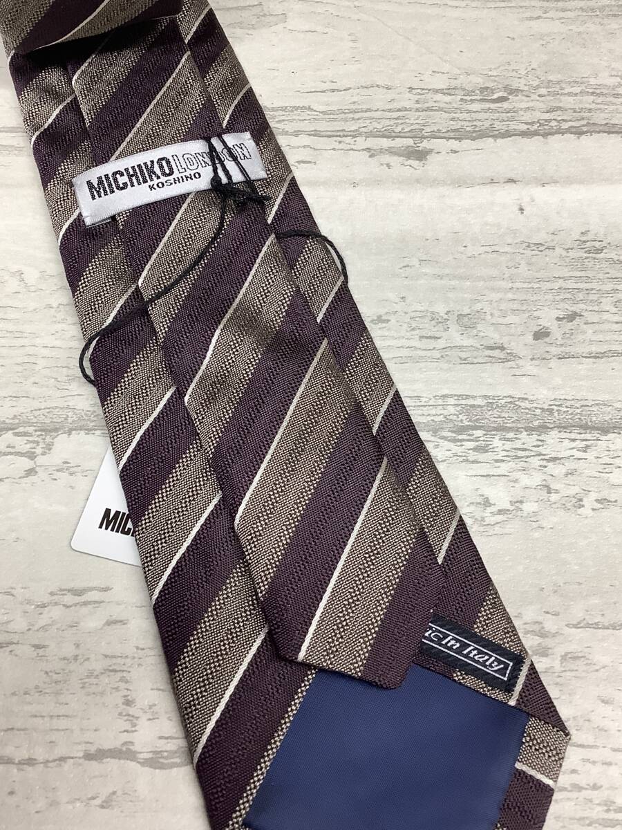 新品未使用★ミチコロンドン 日本製 イタリア生地仕様ネクタイ  エンジと茶ベージュコラボのストライプ シルク100%
