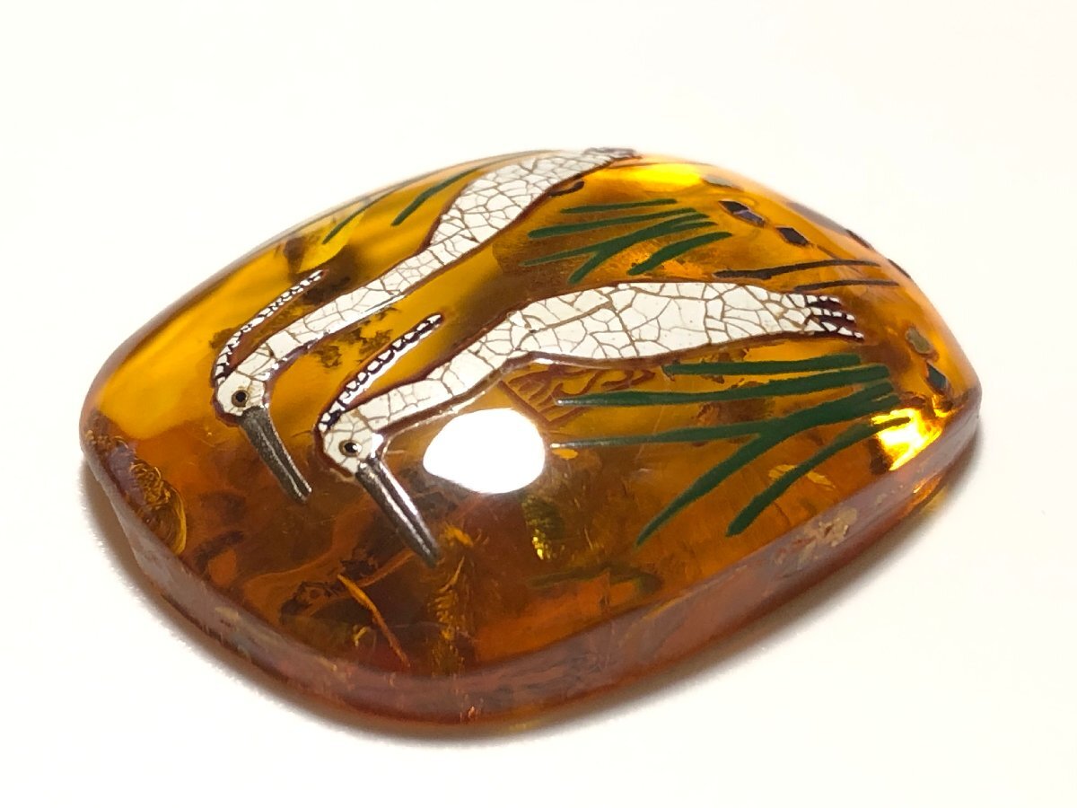 アンティークの本琥珀を使用し、蒔絵、卵殻細工を施した、トキ細工の帯留め・ブローチ用ルースです。作者、松山武司の銘があります。金具を外した跡があり、その時にできた大小の欠けがあります。ケース付属です。