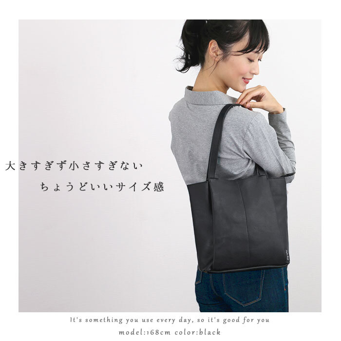 ・生地は、柔らかな手触りと上品なシボ感が特徴的なフェイクレザー素材を使用。見た目以上に軽量な作りで使いやすさ◎