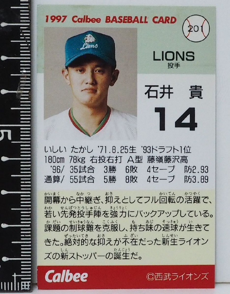 97年 カルビー プロ野球カード 201【石井 貴 投手 西武ライオンズ】平成9年 1997年 当時物 Calbeeおまけ食玩BASEBALL【中古】送料込