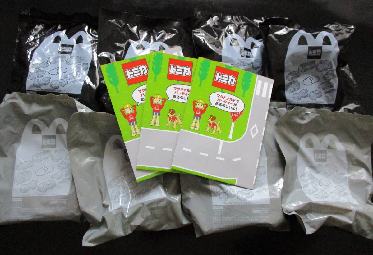 マクドナルド ハッピーセット トミカ 2024の 第1弾 4種、 第2弾 4種(ひみつのおもちゃなし、 プレイングシート3枚のセットです。