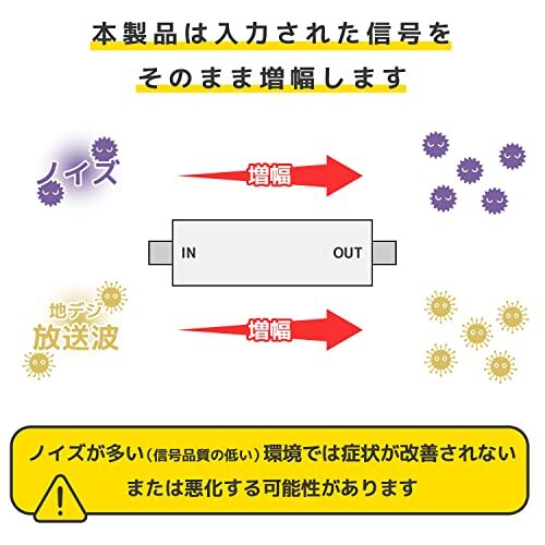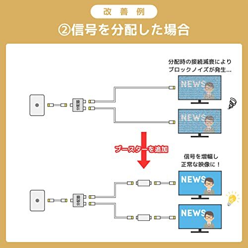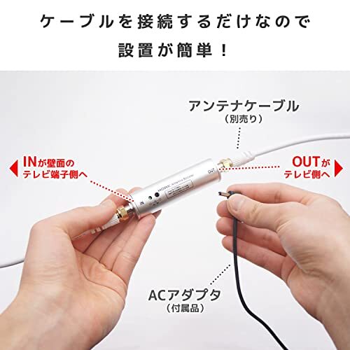 ・黒 HAT-ABS024・周波数帯域:76~777(MHz)・利得:76~222(MHz):11~14dB・利得:470~777(MHz):15~19dB・入力インピーダンス:75Ω・出力インピーダンス:75Ω”特定のチャンネルの映りが悪い” ”ブロックノイズが出る”電波の減衰はブースターで解決します ■地デジブースターで解決 地デジ対応テレビで画面にブロックノイズが発生したり、特定のチャンネルが受信できない等の症状を改善します。 また、複数のテレビ・レコーダー等に分配することで減衰した電波を増幅します。 ■簡単取付 既設のアンテナ配線の間に容易に取付できます。 ■専用ACアダプタ付き ACアダプタのDCプラグを、ブースター本体にあるDCジャックに接続することで給電します。 ※アンテナケーブルは付属しておりませんので別途ご用意下さい。 【FAQ】 ・ブースターを接続したがテレビの受信状況が変わらない 受信電波にノイズや間接波が混入している場合、それらも増幅され改善できない場合がございます。 この場合、ノイズの発生源の特定、アンテナ方向の再調整が必要になります。 ・ブースターを接続したが、テレビのアンテナレベルが変わらない テレビのアンテナレベル表示は電波強度表示ではなく、信号対ノイズ比(C/N比)をベースにした品質レベル表示となります。 ブースターで増幅する際にノイズが混入している場合それも増幅されるため状況によってレベル表示が変わらない場合がございます。 ・地デジブースターを取り付けたらBS放送が受信できなくなった 一本のアンテナケーブルに衛星波と地上波が混合されている場合、本製品は衛星波をカットする仕様のため衛星波を通すことができません。地デジブースターを取り付ける場合は、必ず分波器を使用して分波器の地デジ出力端子とテレビの地デジ入力端子の間に接続してご使用下さい。 ・FM放送の受信状態を改善できるか? 増幅は可能ですが、地デジ放送用として販売しておりますので動作およびサポートは行っておりません。