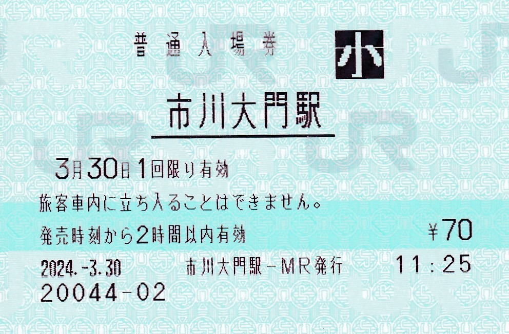 【JR東海】市川大門駅 2024.3.30  機械発行入場券 (4/1より無人化されています)