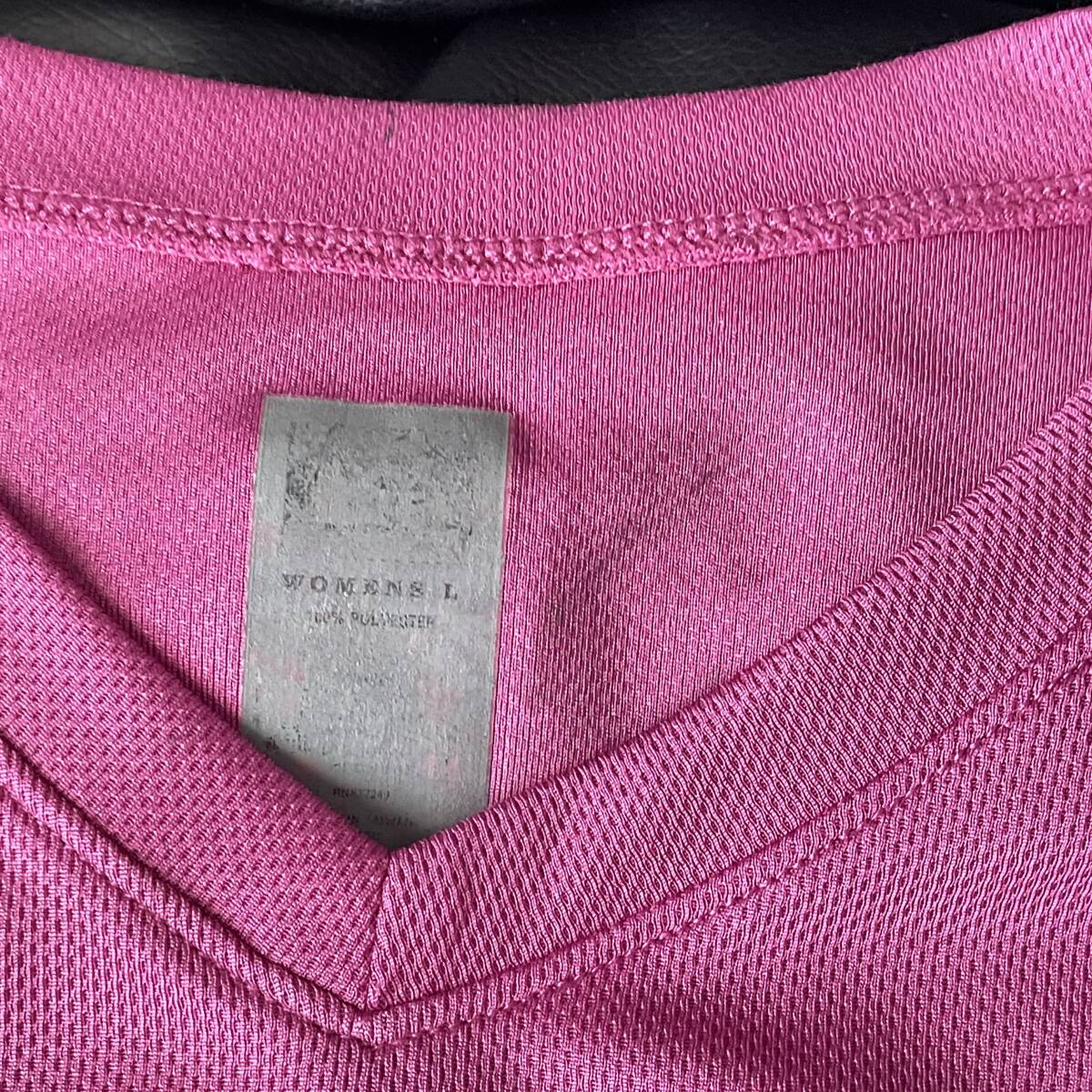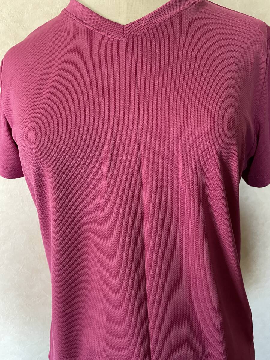 ・Tシャツはアメリカのスポーツ専門店で購入しました。サイズ表記はアメリカwomanサイズのLです。平置きで、身幅43cm、着丈60.5cmです。素人採寸であることを御考慮ください。色は赤紫色です。素材は剥がれていて確認できませんが、左袖に速乾のマークがあります。メッシュっぽい加工がされ薄手です。首はVネックです。裾はラウンド型です。
