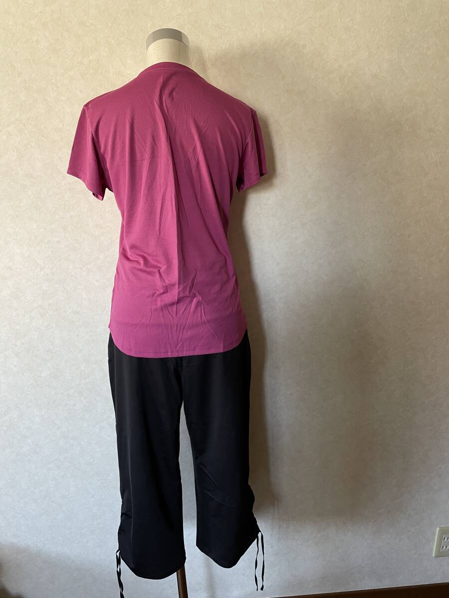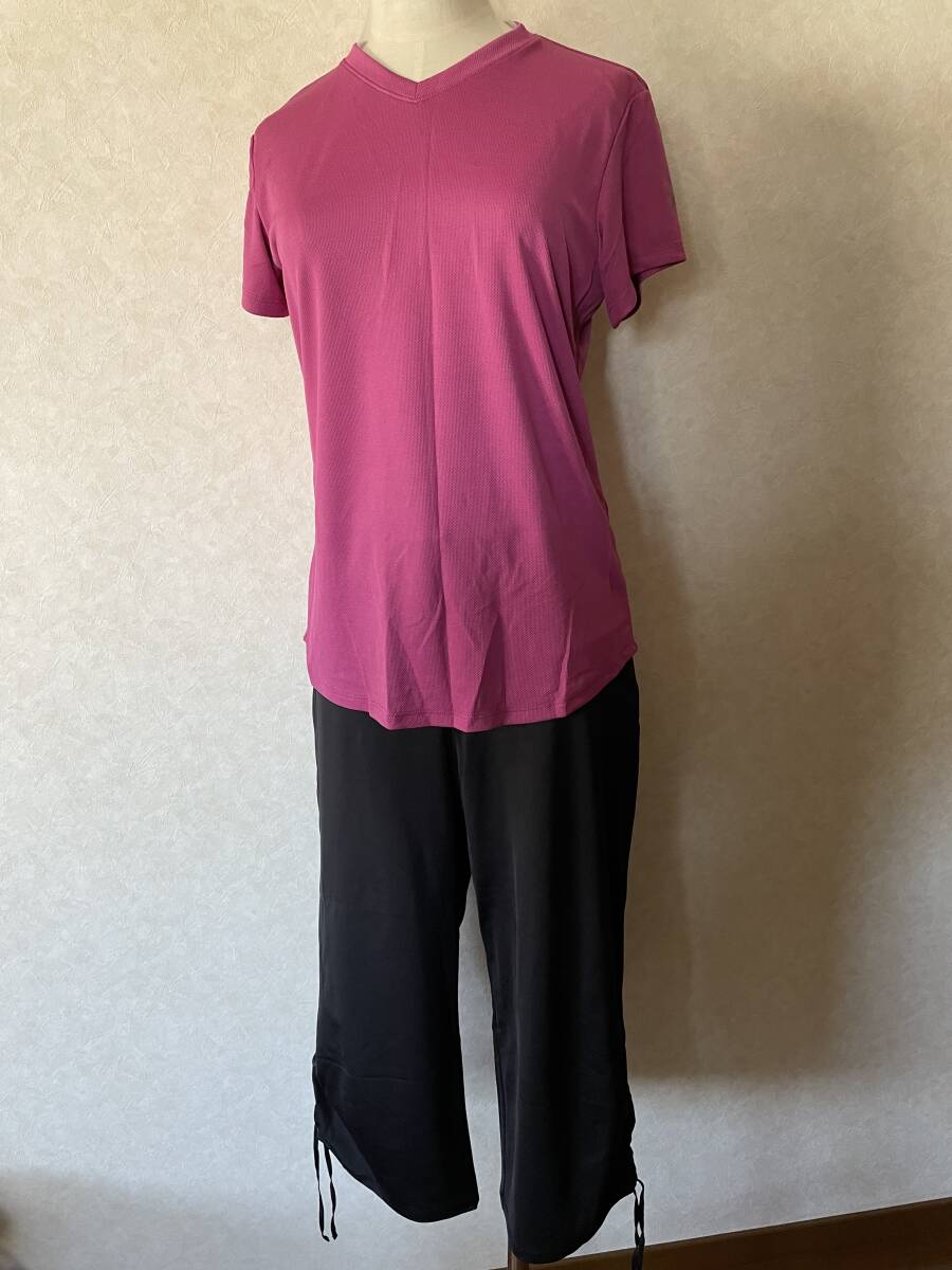 ★111a 送料込み!美品USED Tシャツ+ヨガパンツセット L 赤紫色 黒 ジム★ヨガ ダイエット 運動 ウォーキング 速乾 スポーツ フィットネス